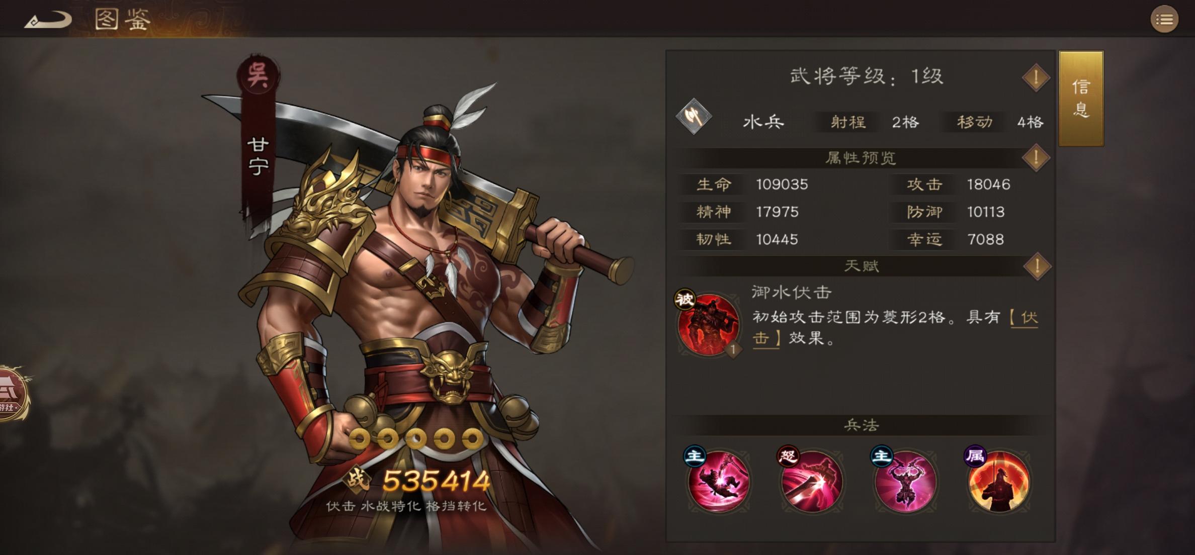 百骑夜袭,威震天下!《新三国志曹操传》全新吴国无双武将「甘宁」周五(1月9日)正式上线!武将传记甘宁,字兴霸。是吴军首屈一指的勇将。曾仅率百骑夜袭曹营而无一伤亡,使孙权欢呼「曹操有张辽,吾有甘兴霸」,很得孙权信任。武将亮点作为东吴勇将,甘宁的天赋技能设计紧扣水战骁勇之本色,恰与其少年时 “锦帆贼” 的外号遥相呼应。而主动技的设计,更深度还原其刺客猛将的凌厉特质,夜袭破阵,一击制敌,定能让