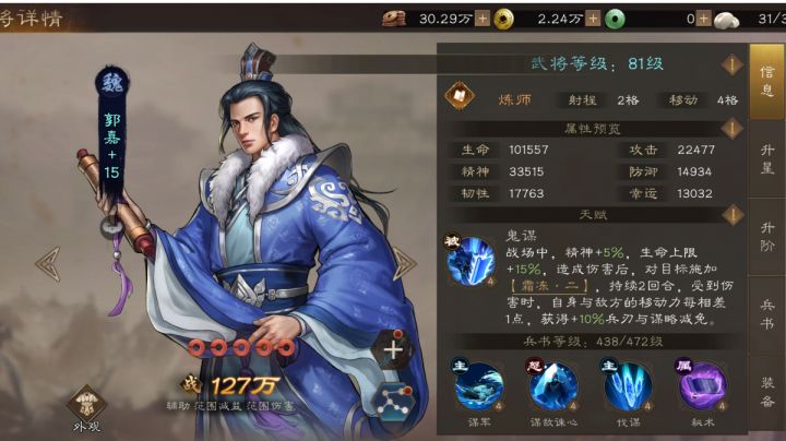 #新三国志曹操传 #三国 #战棋游戏 #游戏攻略 #发现好游戏 #浅评一下 #找点游戏 #新三国志曹操传攻略测评 #新三国志曹操传创作者征集令 郭嘉属于道士职业,战场特效是谋略伤害减免,被动则是谋略增伤与减伤天赋:被动获得10%精神与15%血量,当与对方移动力不等时,每一格移动差减伤10%;核心:造成伤害施加霜冻2或3,多段伤害算多次触发,霜冻3可叠3层,霜冻2只能叠两层且没有减少减伤效果,霜
