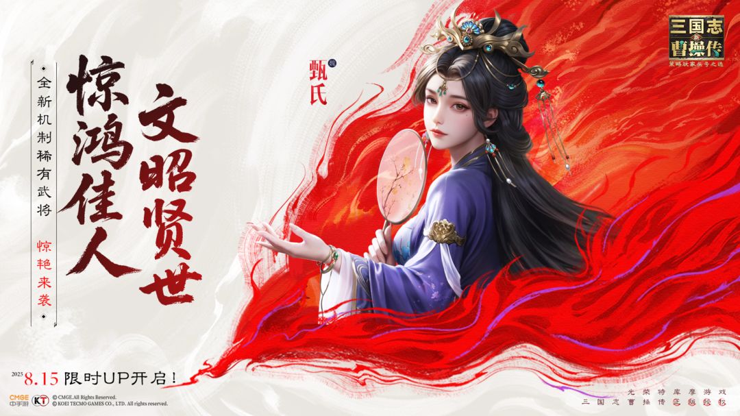 万众期待的全新机制稀有武将——「甄氏」来啦,全新限时UP卡池将于8月15日开启!作为版本新推出的机制武将,甄氏不仅绝美颜值,还能为阵容搭配带来更多的可能性,极大得提升阵容容错率。她具有独一无二的增益机制-护盾机制,无论是辅助续航还是策略联动,都能有不俗的发挥空间!今天就带大家领略一下这位才貌双全的绝世美人的独特的魅力吧!【甄氏生平简介】绝世美人。袁熙之妻,后成为曹丕之妻。生有曹叡、东乡公主