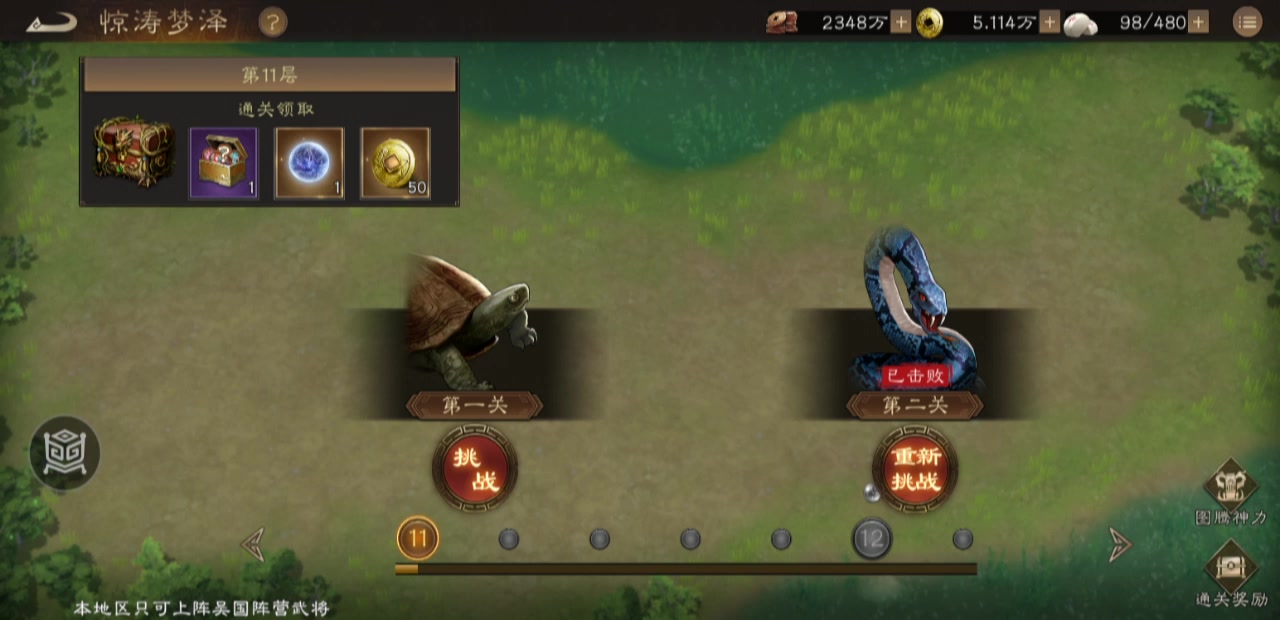 之前都是被一刀一个小朋友,根本没有操作空间,纯数值怪,毫无游戏体验,最近迎来难度调整,不至于被秒了,吴国11层迎来分支,吴国队需要分成两队去应战,我们把周瑜主力去放到第二关,有周瑜领衔第二关不在话下了,下面说下第一关非主力阵容如何通关。 阵容:孙尚香领衔,孙权、黄盖、小乔辅助。 站位:孙尚香头位,另外三人后排依次。 主力们的神兵装备给这几个人分一分,开局小乔给众人上受击回血技能,孙权上去铺地块
