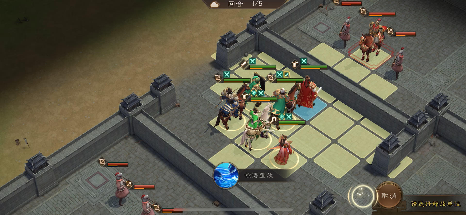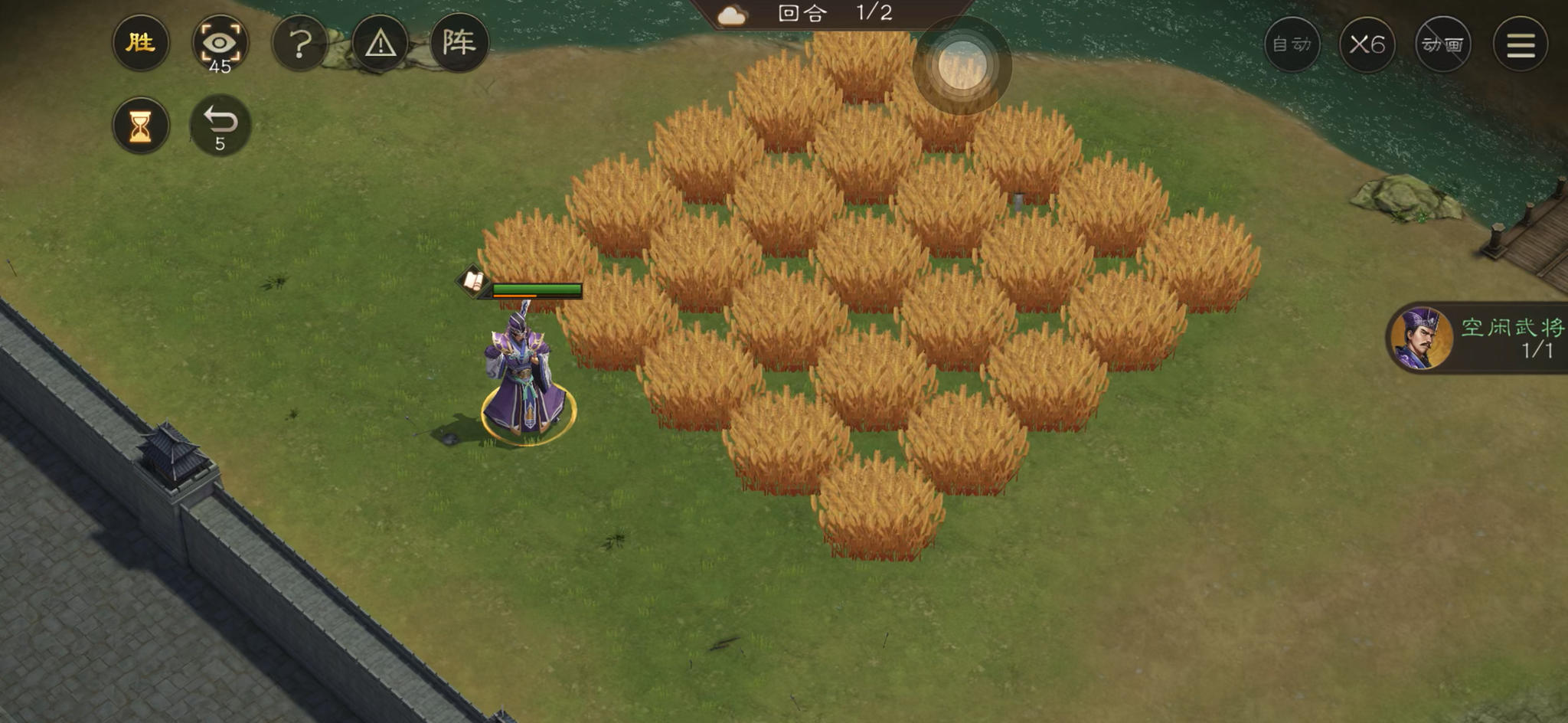 #新三国志曹操传创作者征集令 其实这个任务挺简单的,比上一个游历任务兵营演武简单多了[表情_捂脸哭] 一开局,不要想着尽可能多的清草,而是要观察李儒技能框与草地的形状契合度,就类似我们小时候玩的七巧板,只不过现在的背景是一个5x5的方块,而我们手里的板就是李儒两个技能的覆盖范围。 所以第一回合走到中间即第三块枯草下方,释放一技能,技能的释放点选择第二行中间的枯草,这样刚好能把左下和右下两个角都清