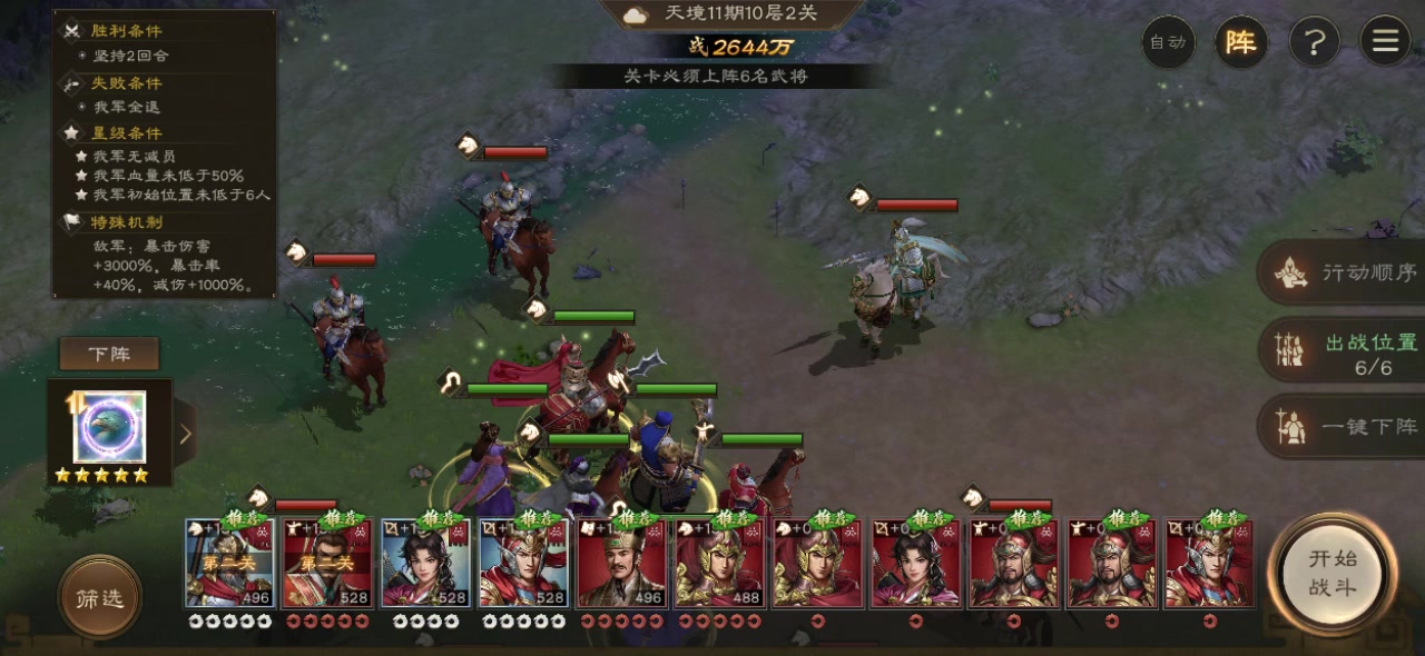 10–2的关卡机制:敌军暴击率+40%,暴击伤害+3000%,减伤+1000% 关卡要求: 1.无人撤退(所以最好带甄姬) 2.要求我军不能移动(也就是要硬抗到底) 3.所有人血量不能低于50%(所以要有奶妈,这里推荐小乔) 核心思想:吴国队,防止被暴击 核心策略:硬抗或者干死赵云,这里策划干死赵云的思路,用周瑜孙权和小乔三个王炸! 首先,站位周瑜,孙权(搭配周瑜),孙尚香,后排小乔