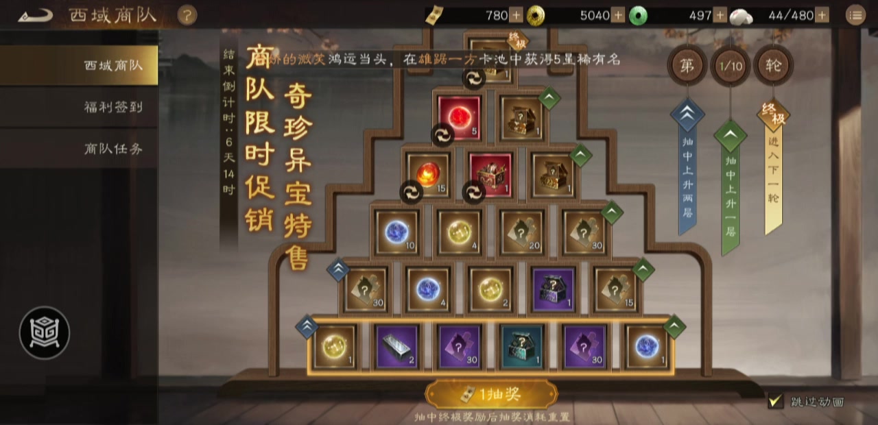 继上次商队搞满10轮后,正常来说这次是满不了10轮的,不过上次新更新的历战基金没动用,留到这次刚刚好,基金已清空,估计下次就是神兽基金了吧~准备好780张票奔着10轮进攻后就剩几千金珠当零花钱了,这次又双刷新了记录,10轮下去还剩了30张,平均一轮75…这次运气比上次强一点上次77.77! 为了有些萌新小伙伴不知道新更新后的商队选什么,下面再次介绍一下更新奖品后的西域商人活动每轮哪些最值得优先选