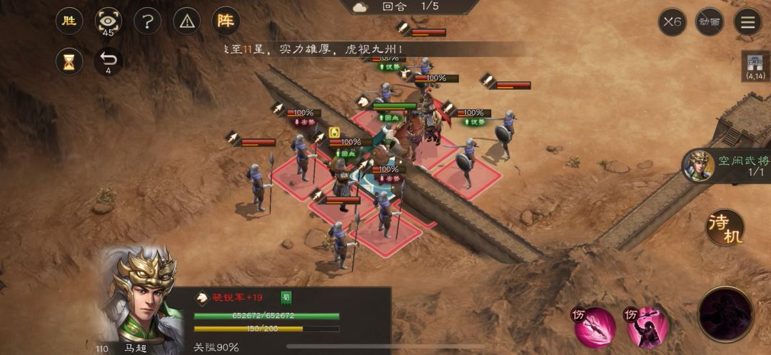 因为本次3星需要马超最后在关隘内,而下方的枪兵都是戳2格很容易就让马超没法在关隘内结束,因此要先往下方打。 马超先用技能顶开下方敌人,可以使得枪兵只能近距离攻击马超,以至于被反击而死。 第二回合就大局已定了,直接两个大招收完敌人即可。 这关总体不难,只要第一回合打好了,第二回合就随意解了。