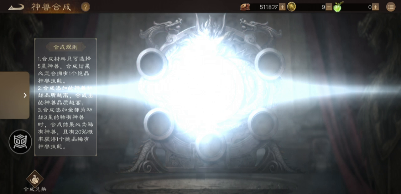 提到升星就一定少不了要用到狗粮,合成就是用没有稀有彩技能的垃圾们合成,合出来的一定有彩技能,就是赌有没有稀有彩技能,要是合出稀有彩星如增减伤,蛛网等技能就是血赚,能合出稀有神兽也非常赚,虽然5合1大概率是个垃圾,但合成的好处是给币,也算是个保底机制吧,可以用垃圾合出来的币换初始三星的神兽,那个箱子只能开出随机三选一:狐狸 九婴 青鸟,万一开个绝品稀有技能当底子那真是非常幸运,不仅能节约一个果子,还