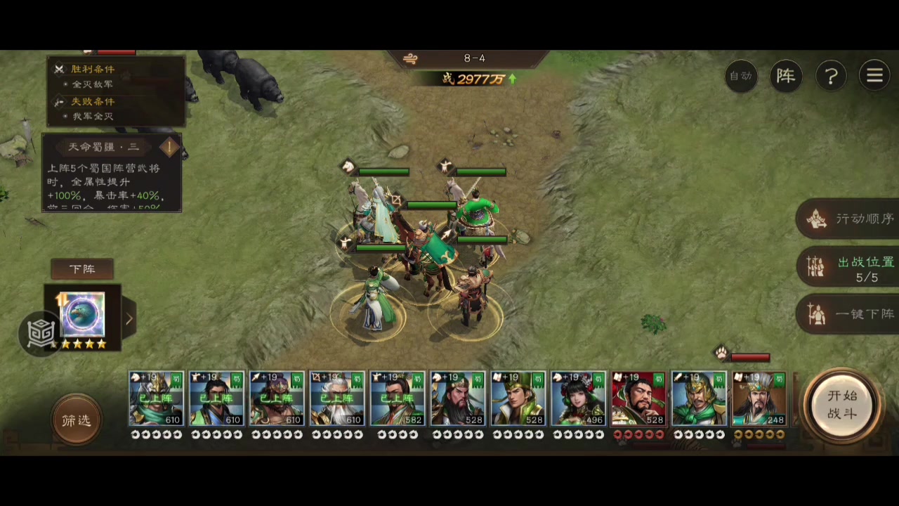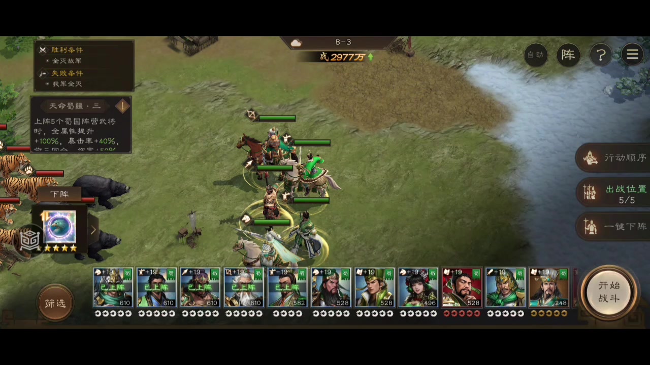 #新三国志曹操传创作者激励 仍然是107级,3级等级压制打法参考。 通关思路: 本关较难,采用了用赵云凹闪避的方法 不凹闪避也可以用魏延换下徐庶,帮忙分摊伤害 除赵云外其他人往有利地形撤退 尽快消灭老虎,老虎伤害虽然高,但防御不如熊,相对容易快速收掉 黄忠主力输出还是要保护好