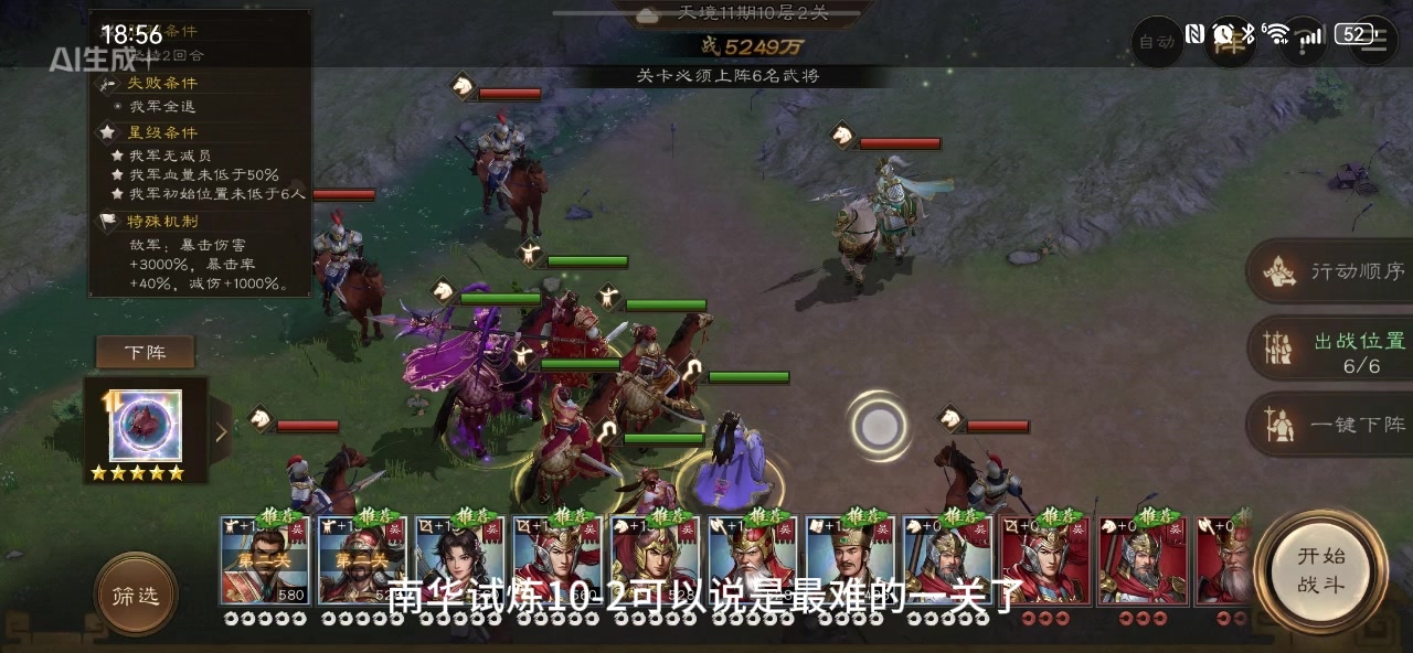 整期南华试炼最难的一关,也是打了很多次才过的。孙权如果有5星神兵会很轻松,我没有只有4星,所以也是打了好几次过的。核心就是堆抗暴属性,甄姬小乔孙坚,这三个必须带土木星符,增加抗暴击率,剩下的三人吕布周瑜孙权都是主力,小兵不打,不用管他们,孙坚和许褚都可以,这两个都三星过关过#新三国志曹操传 #新三国志曹操传创作者征集 #新三国志曹操传创作者征集令 #新三国志曹操传攻略