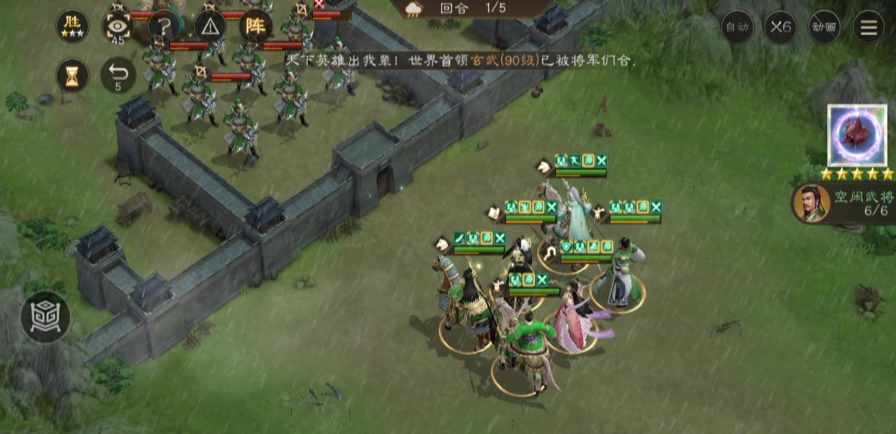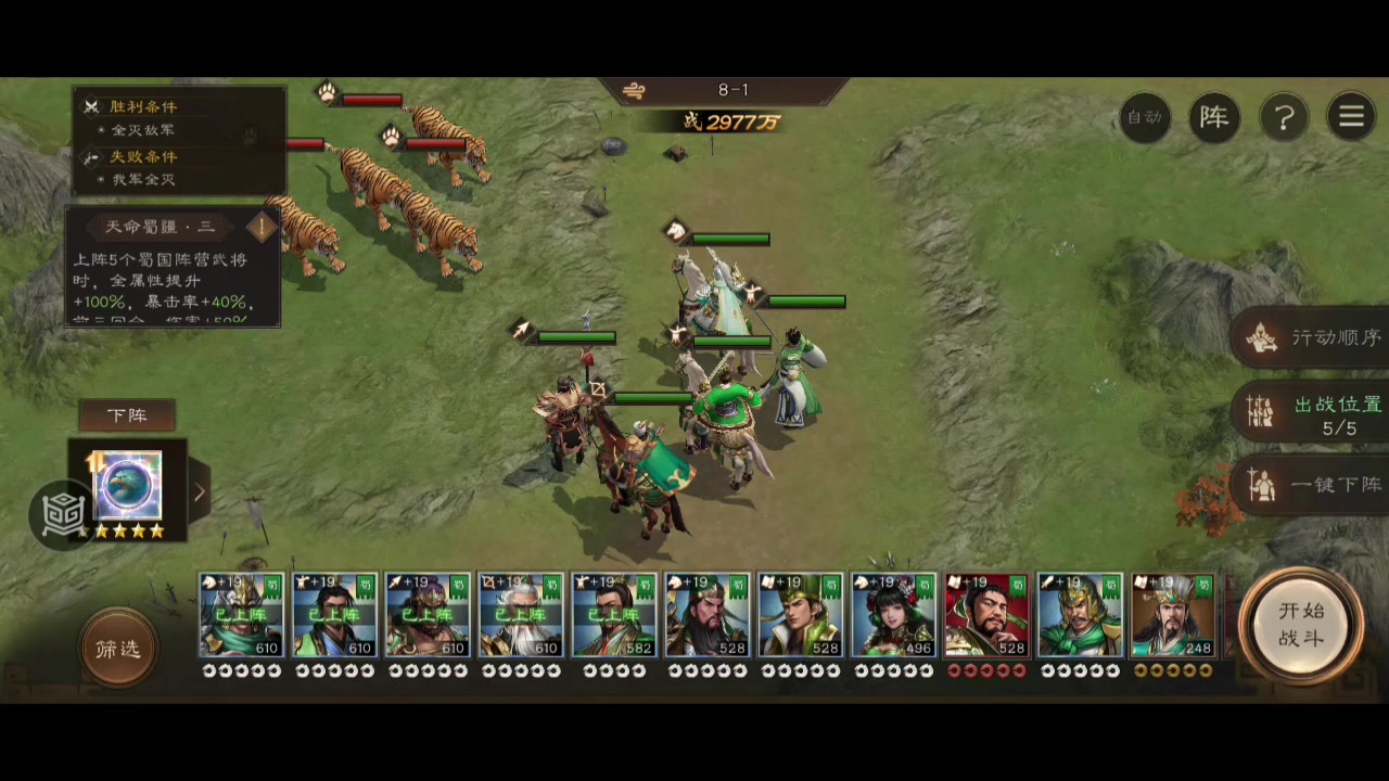 这关有诸葛亮貂蝉赵云的就显得非常简单了,纯机制通关,不需要砍人,也要求不被砍,被砍到就是被秒,所有诸葛亮大招顶上去完美堵住所有敌军,敌军只能通关唯一一个身位的关隘出来,诸葛亮大招占领顺便免疫所有伤害最方便。 另一个要求是初始站位通关时要保持5个人落位,而敌军弓兵射程是能覆盖到初始站位第一排的,也就是说第一排两边的位置必须挨一次攻击,一次就行,因为另一侧的人可以蹲第一排的中间,这个位置是安全的,另