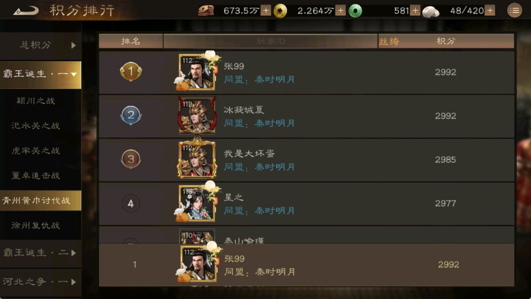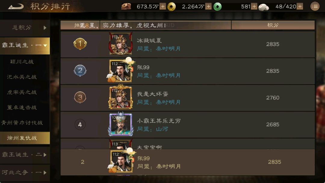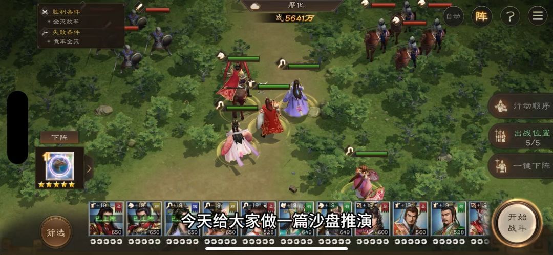 出战人物:诸葛(木日,火日,木火),曹操,刘备(神兵5),徐庶,荀彧,袁术,庞统,法正,周瑜,郭嘉。 全上挂件加属性,刘备没神兵的话建议不要硬吃,曹操上个状态再吹,记得走到草里。 #新三国志曹操传创作者激励