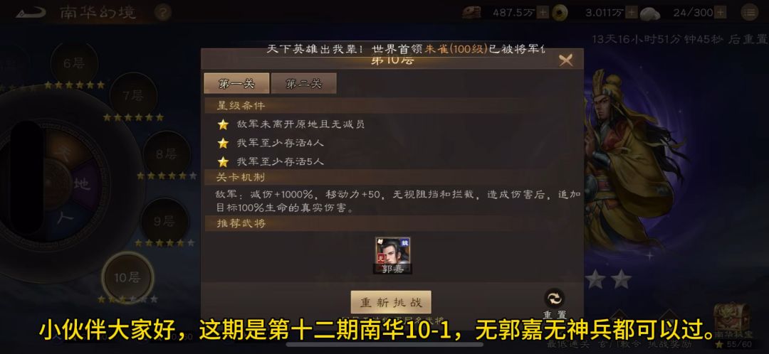 出战人物:诸葛(木日,火日,木火),曹操,刘备,周瑜,郭嘉,庞统,关羽,貂蝉,公孙瓒,曹仁。 这关有磐石和复生,只能推过去~关键点在于法师清线和关羽第一回合进城聚怪。 #新三国志曹操传创作者激励