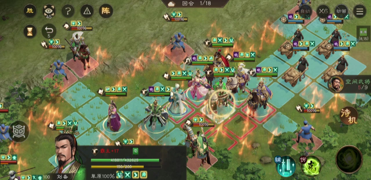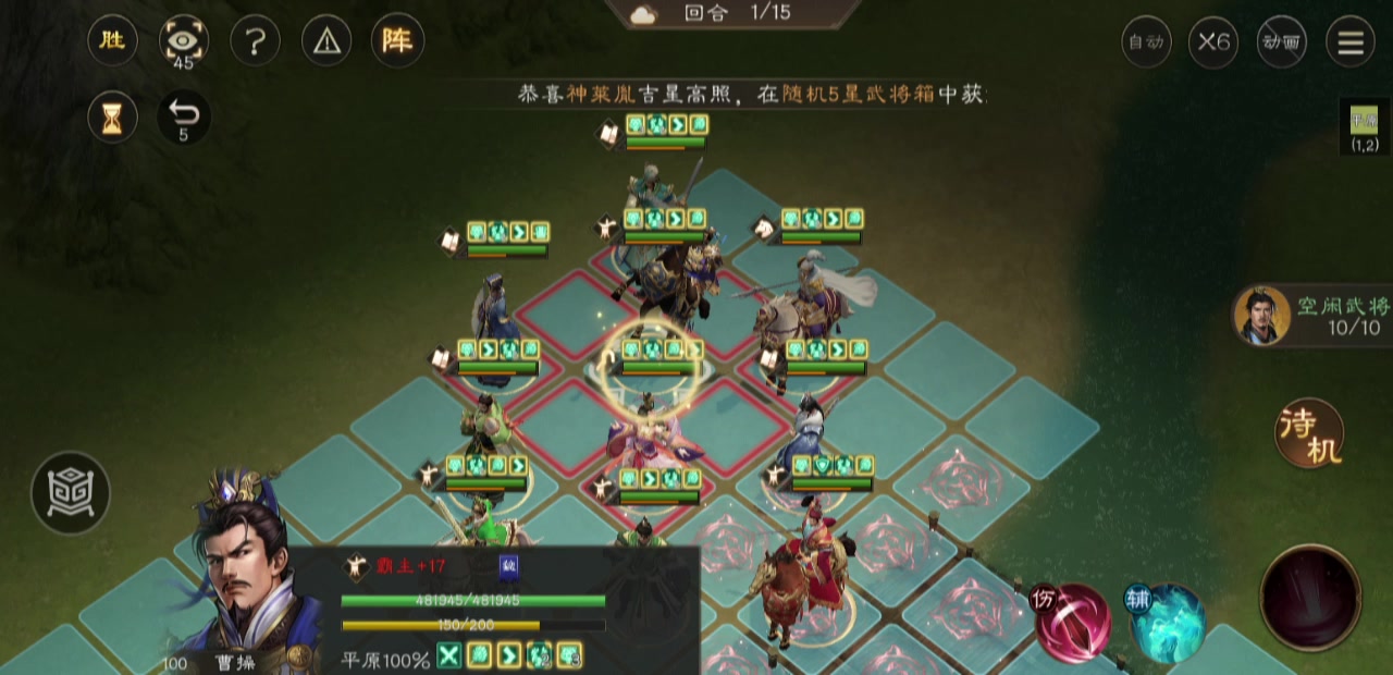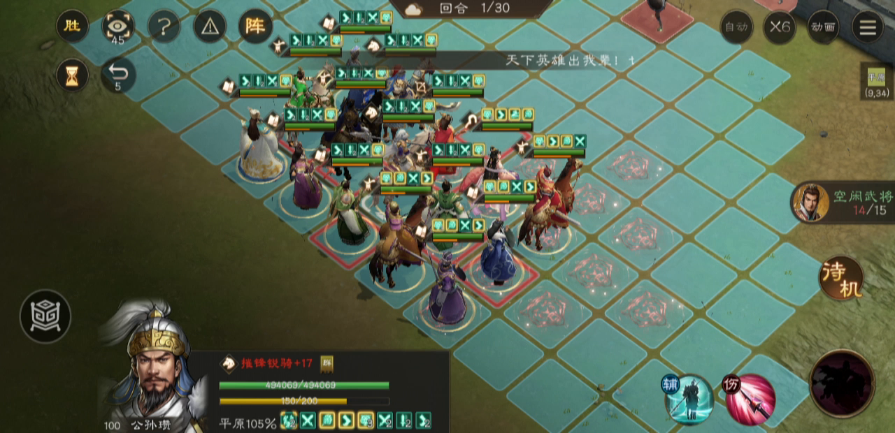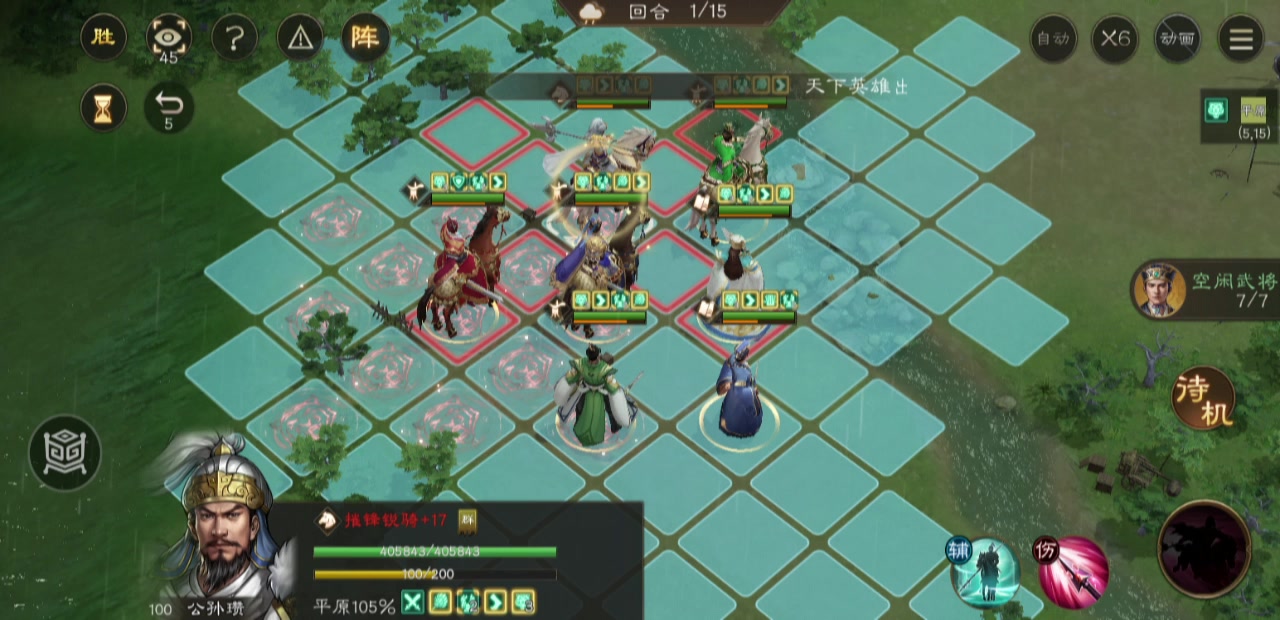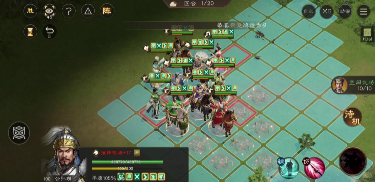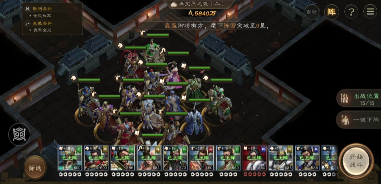 这关开局站位很重要,优中选优的站位,环环相扣,郭嘉关羽攻右路,我郭嘉星低,只能靠带星符才能打死周瑜,诸葛亮全屏风吹下路,可惜伤害差点孙权吹不死,让擅长荒地的庞德去补刀,顺便这一回合调整其他人的站位,吕布随便带一个人去左路引出刘备张飞,吕布2回合干掉两个人的同时,其他人上加移速buff,最终第四回合引出boss诸葛亮,这里诸葛亮的技能是够不到敌军诸葛亮的,必须先让庞统拉一下才能让对面改变站位,庞统也