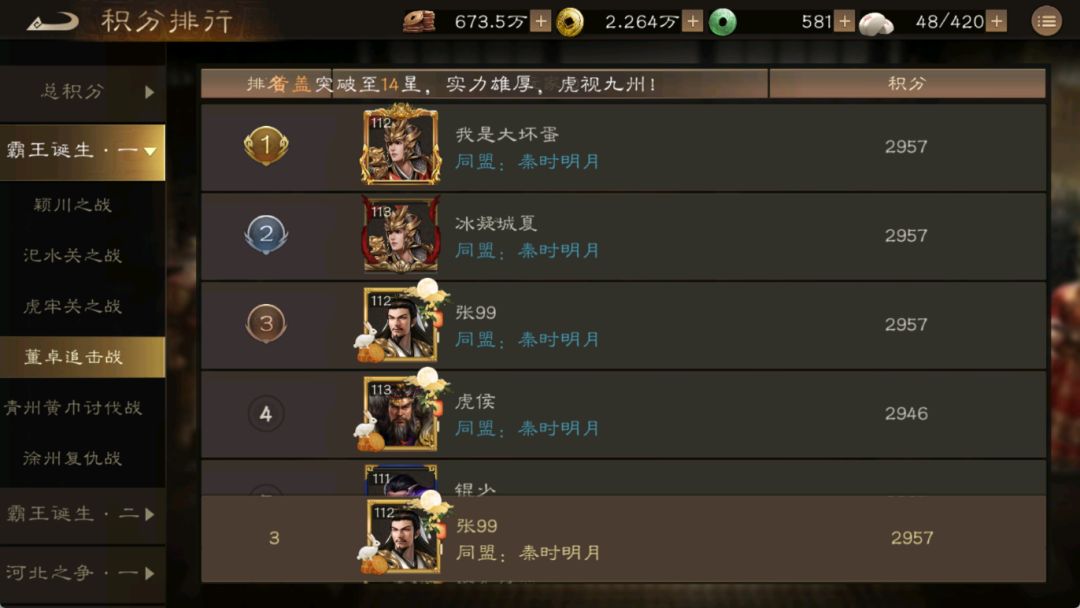 出战人物: 诸葛(木日,火日,木火),曹操,刘备(神兵5),徐庶,荀彧,袁术,公孙瓒。 比较极限,得刷出对面不格挡。重开了几十把才打到三动。刘备无神兵也可以打到4动2957分,上马腾把袁术换了,多重开几把。 #新三国志曹操传创作者激励