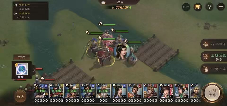 #新三国志曹操传创作者征集令 #新三国志曹操传攻略 直奔主题 上阵武将 吕布(250000攻击),许褚(金土 水火 木水),甄姬,貂蝉,华佗(13星+1星神兵没有练度) 甄姬加护盾,吕布先2技能,貂蝉再动,开大招秒掉一个小兵,许褚不要开护卫,丢石头打其中一个兵。华佗1技能睡杀剩余3个小兵(注意,如果不能全部中,需要重新来,放心几率很大)。这里需要注意站位,尽量让小兵打吕布,吕布反击打伤害很关键!第