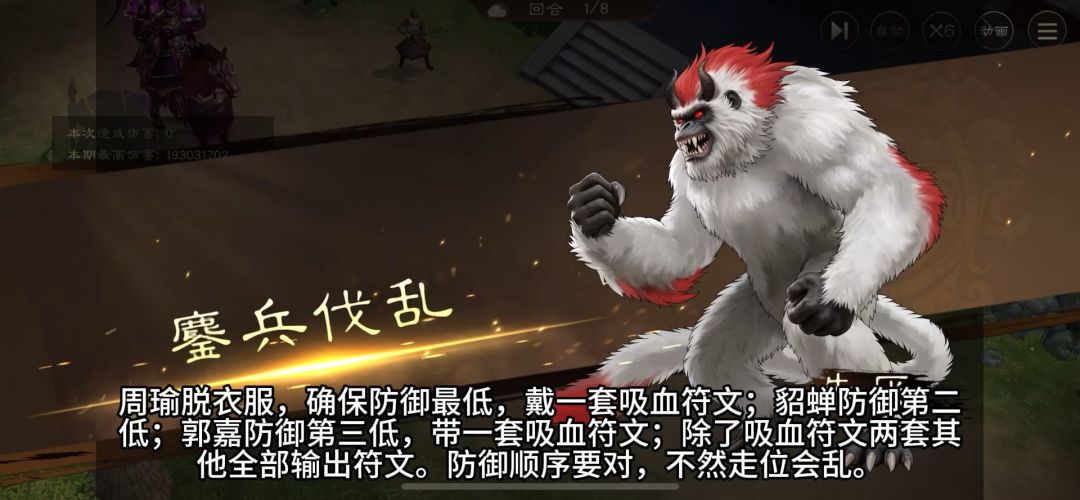 #新三国志曹操传创作者激励 【推荐阵容】 吕布、诸葛亮、郭嘉、周瑜、貂蝉 【神兽要求】无,选增伤最多的那个上场就对了! 【符文配置】 • 周瑜 & 郭嘉:各携带1套吸血符文 • 其余武将:全输出符文 【操作要点】 1. 利用敌方攻击机制:敌军会优先攻击范围内防御力最低的单位。 2. 防御排序控制: • 周瑜必须保持全场防御最低(可直接卸除防御装备达成) • 貂蝉保持第二低 • 郭嘉保持第三低 3