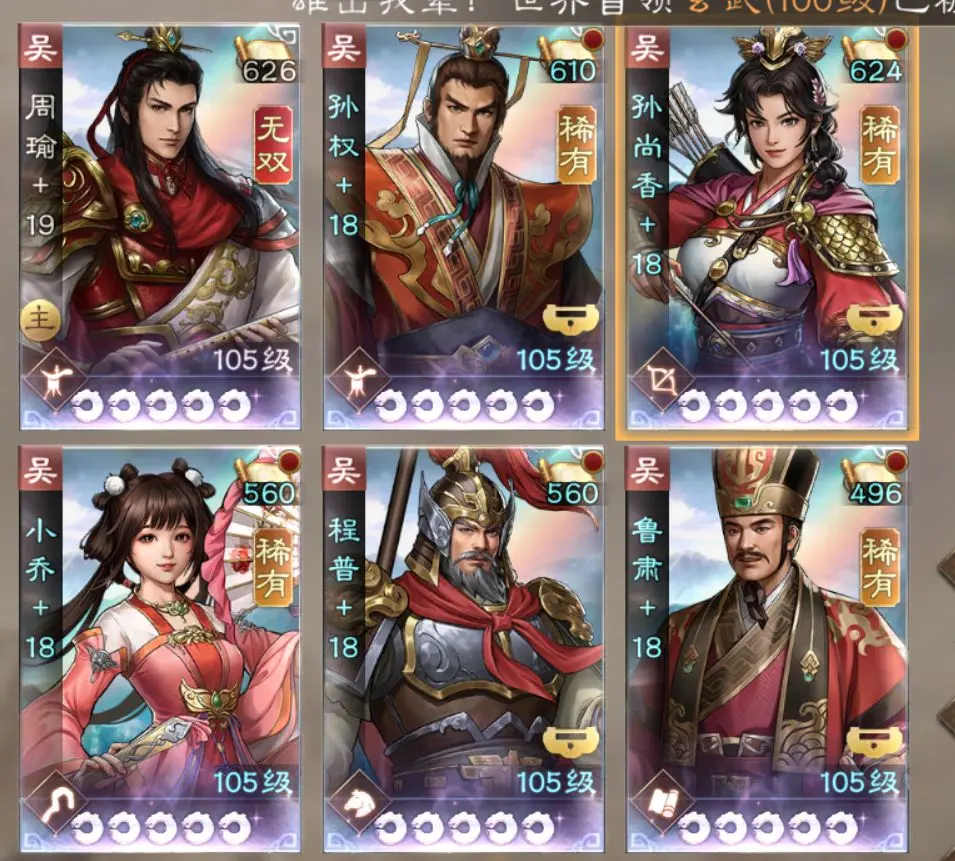 #新三国志曹操传创作者征集令 周瑜:三国第一近战法师,绝对核心。小乔:周瑜的好伴侣,加上持续掉血伤害80%。孙权:吴国核心辅助,铺地。孙尚香:吴国远程攻击补刀手,能叠层数。孙策:单点伤害比较高,可以弥补吴国单点攻击的不足。