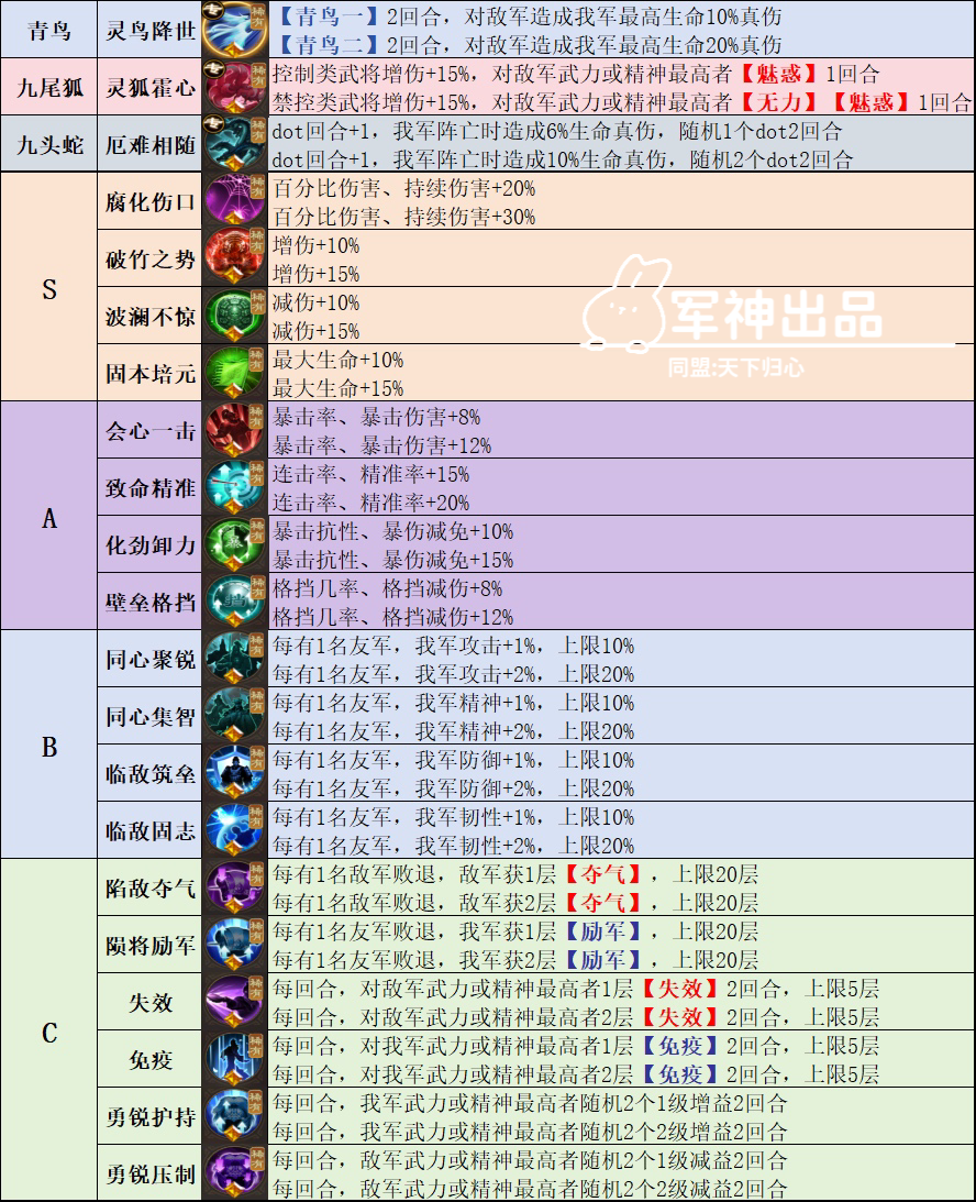 神兽稀有技能分类如图表👆🏻所示:(官方正式技能名称对于读书少的大家来说难免有些拗口,以下采用俗称替代)【S】级别4个,分别为:蛛网 虎头 龟壳 绿旗这4个稀有技能在一众神兽技能中出类拔萃,毋庸置疑;【A】级别4个,分别为:暴击 连击 防爆 格挡A级别之所以比S低一档,在于属性并不是所有人都需要,例如辅助不需要暴击 连击(由于青鸟神兽的存在,暴击在A级别中又是最优);【B】级别4个,分别