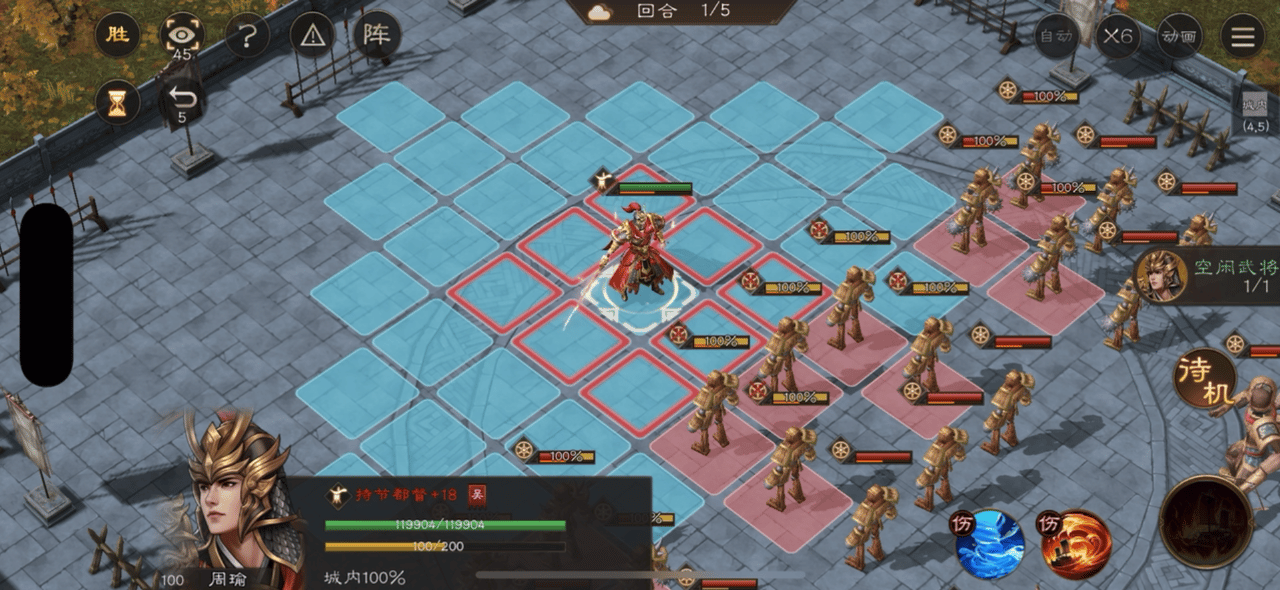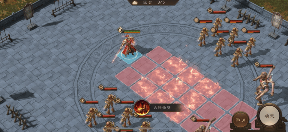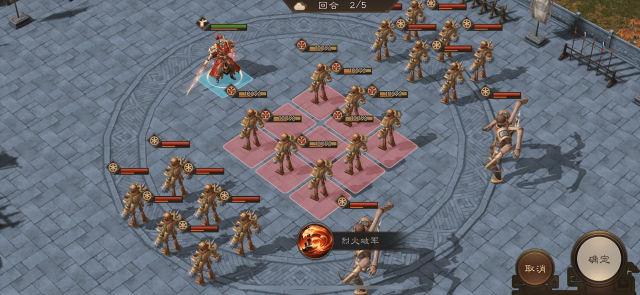 本关敌人防御高,反击高,需要合理顺序击杀和适当站位。看白毦兵防御被动,周围同阵营人越多防御越高。因此击杀策略为,先击杀第一排左右两边的白毦兵,其次中间两个,然后下一排同理。援军全部选择弓兵,攻击范围大,策士攻击尽量斜着打,在反击范围外打。第一回合,按弓兵,策士,弓兵顺序击杀第一排左边白毦兵。医生可以上前斜打中间白毦兵,也可以待机。第二回合,又上阵2个弓兵,消灭第一排中间白毦兵。实际优先击杀最右