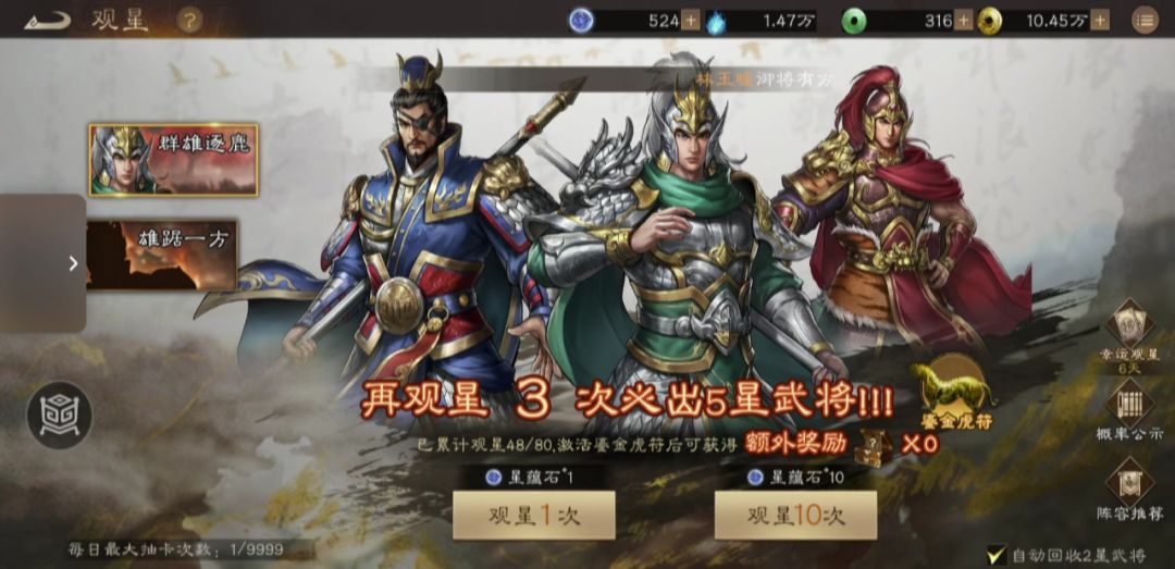 蓝抽优先级大大降低,只攒到500多抽,稀有比较好用的基本都满了,这次其实运气还挺好,500抽稀有给了荀彧,赵云,董卓,荀彧可以到11星了,另外两个都是炼魂,还不保底的给了许胖…还不如给另外几个无双,下期马超还能多换出来一个。观星选来选去还是选择了炮车刘晔,主要用来打魏国神兽本。 魏国神兽本堪称所有阵营最难的,唯二稀有都是辅助…严重缺输出,夏侯惇也不行了,而且怪物都是要连击后才能打的动,上个高增伤