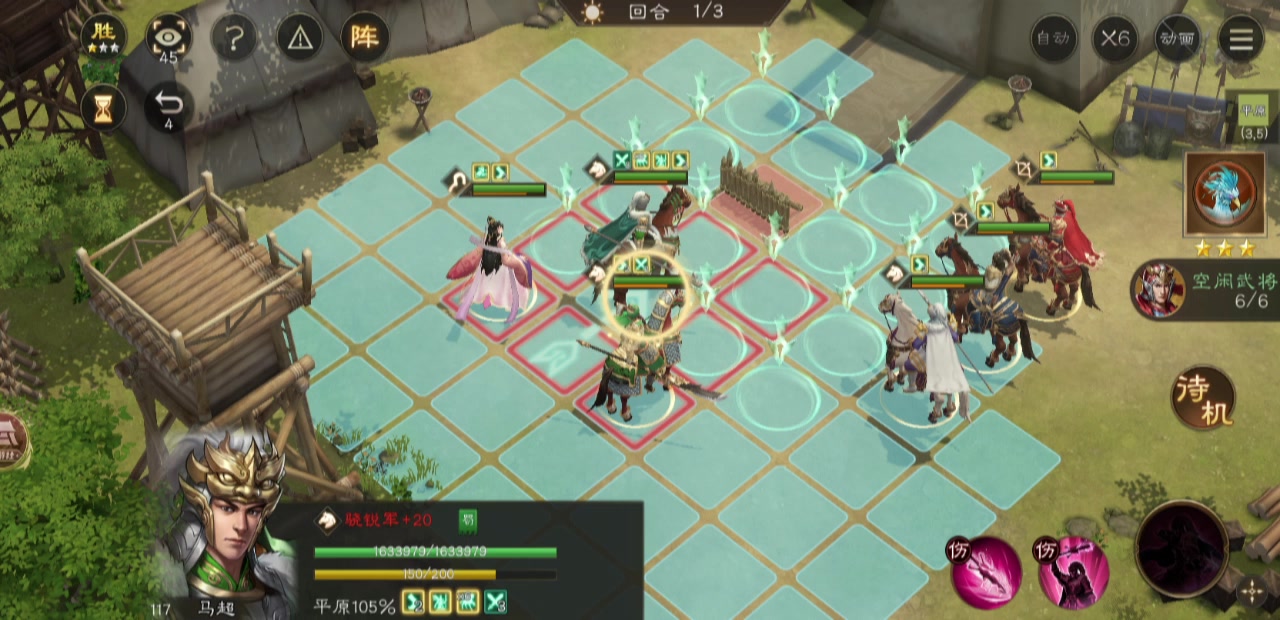 上阵武将:马超,夏侯渊,太史慈,公孙瓒,貂蝉,关羽(需装备二动马) 开局马超小技能叠怒顺便踩一个格子,另外至少有一把神兵,武将星级倒是无所谓,貂蝉回归马超踩一个格子,马超大招4次踩4个格子,第五次大招选择突出去,为了第一条成就,结束的时候需要一个人脱离光点,这里就选马超脱离出去了。 夏侯渊,太史慈,公孙瓒都会伪二动,每个人各踩两个格子,公孙瓒的二动是需要放能造成伤害的小技能才能在动一下,放加状