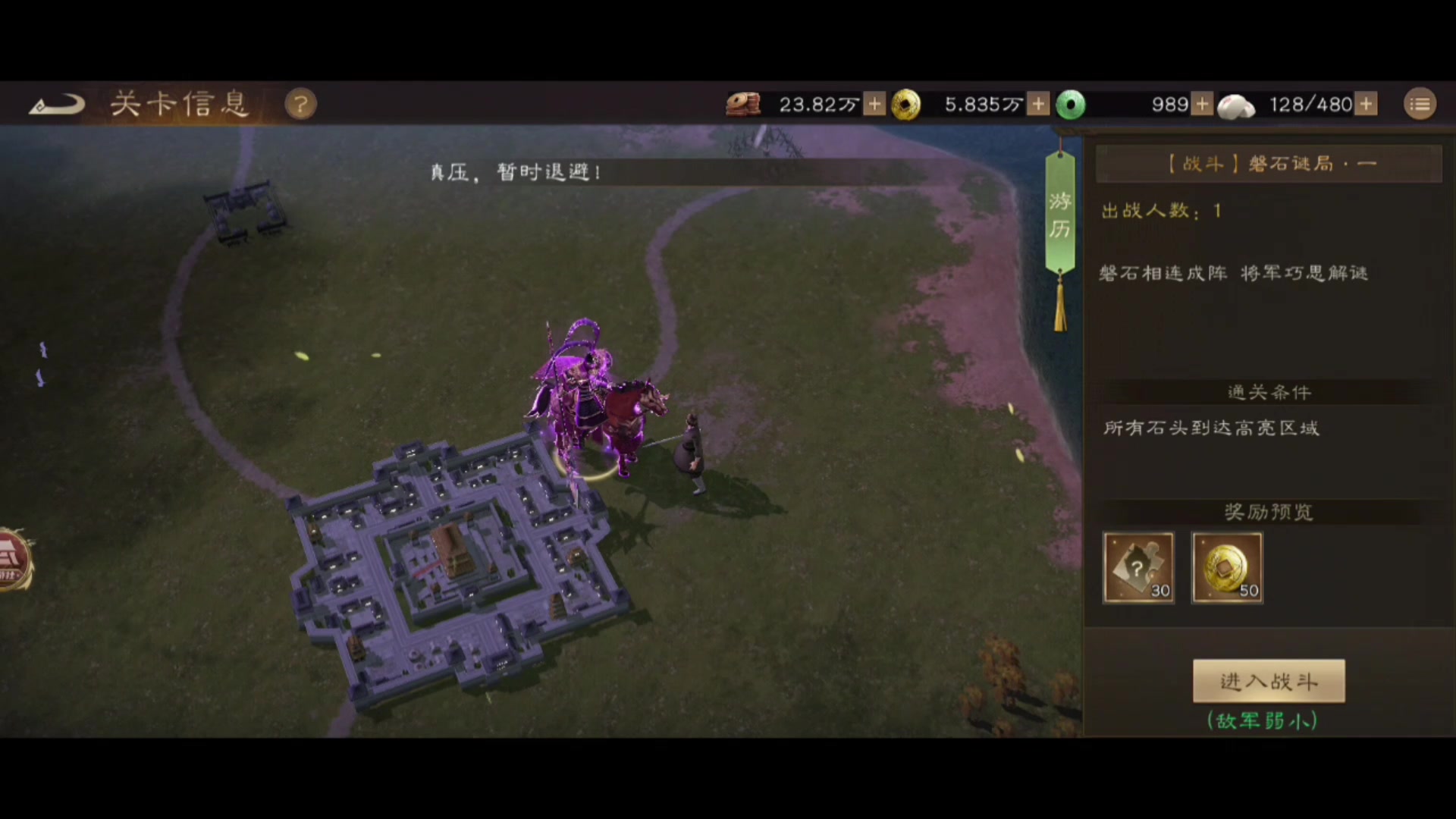#新三国志曹操传创作者激励 通关要点: 石头可以向前推4格,过程中如果遇到障碍物则会被阻挡 两个石头推至目标点可以通关 观察利用开局的石头,帮助右路石头定位 充分利用建筑物把左侧石头推进角落里 右路石头定位后两步刚好推进至目标