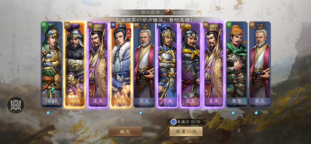 稀有品质的比较好用的基本都满了,新一轮观星甚至不知道选哪个好了,蓝抽终于不用花玉买了,也因为没花玉,攒了这么久才500多抽,本来指望能抽个无双的,换个周瑜上15星,结果没出,那就等几天后演武结算买最后那一个吧。 后出的稀有品质如甄姬,庞统,小乔都还不错,值得拉满15星,目前稀有箱子也多了,金秋活动光签到就送了俩,现在拉满星比以前容易多了,就是神兵自选依然缺口大,后续资源主要用于提升神兵了,蓝抽这
