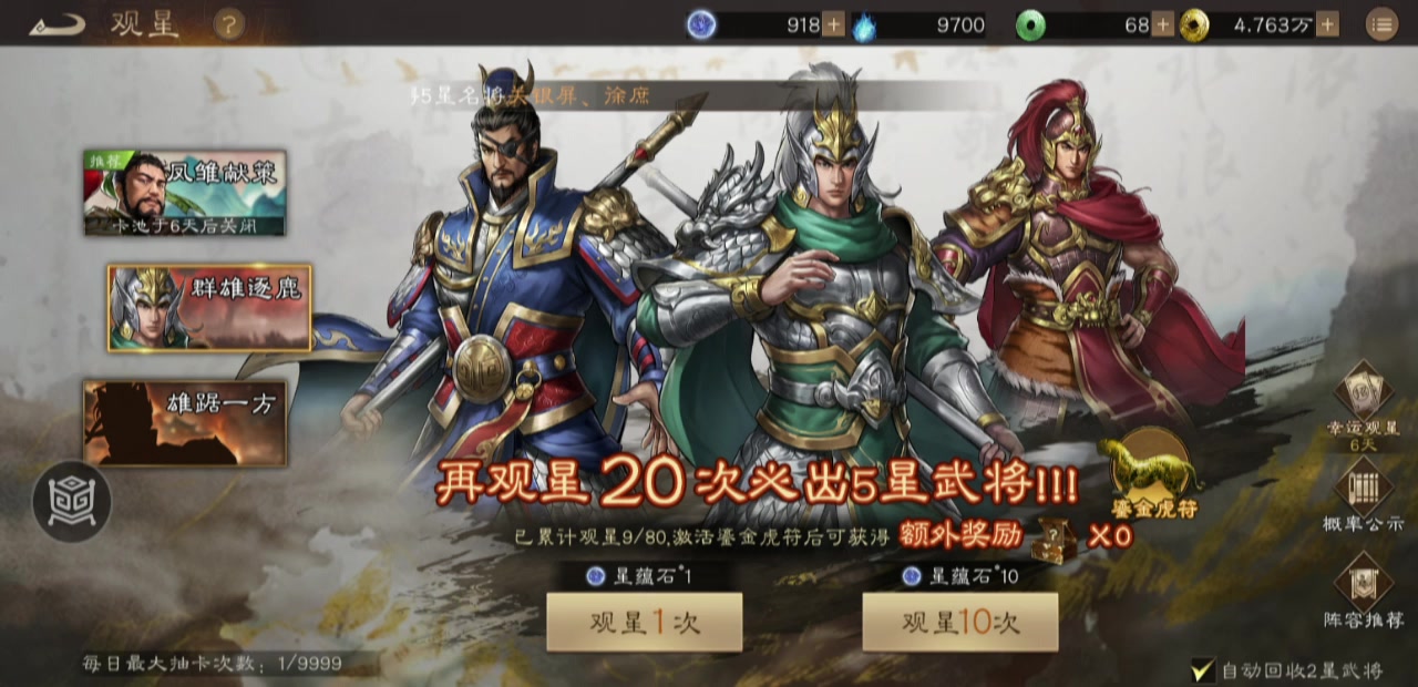 继香香之后,培养优先级终于轮到了赵云,这次一共给了4个稀有,其中也有个子龙,很不错,还有一个庞统,强度还有待商榷,这种事还是交给能抽满的氪佬吧,毕竟也只是稀有强度,马上就出无双诸葛亮了,俩人都是法师装备,氪佬以下弄一个就不错了,所以没抽庞统特定池子,另外两个都给了孙权,正常来说大池子稀有能给君主运气都是非常好的,只不过上次已经把孙权拉满星了,结果这次疯狂给…行吧,不影响练成魂自选一个也还行,保底无