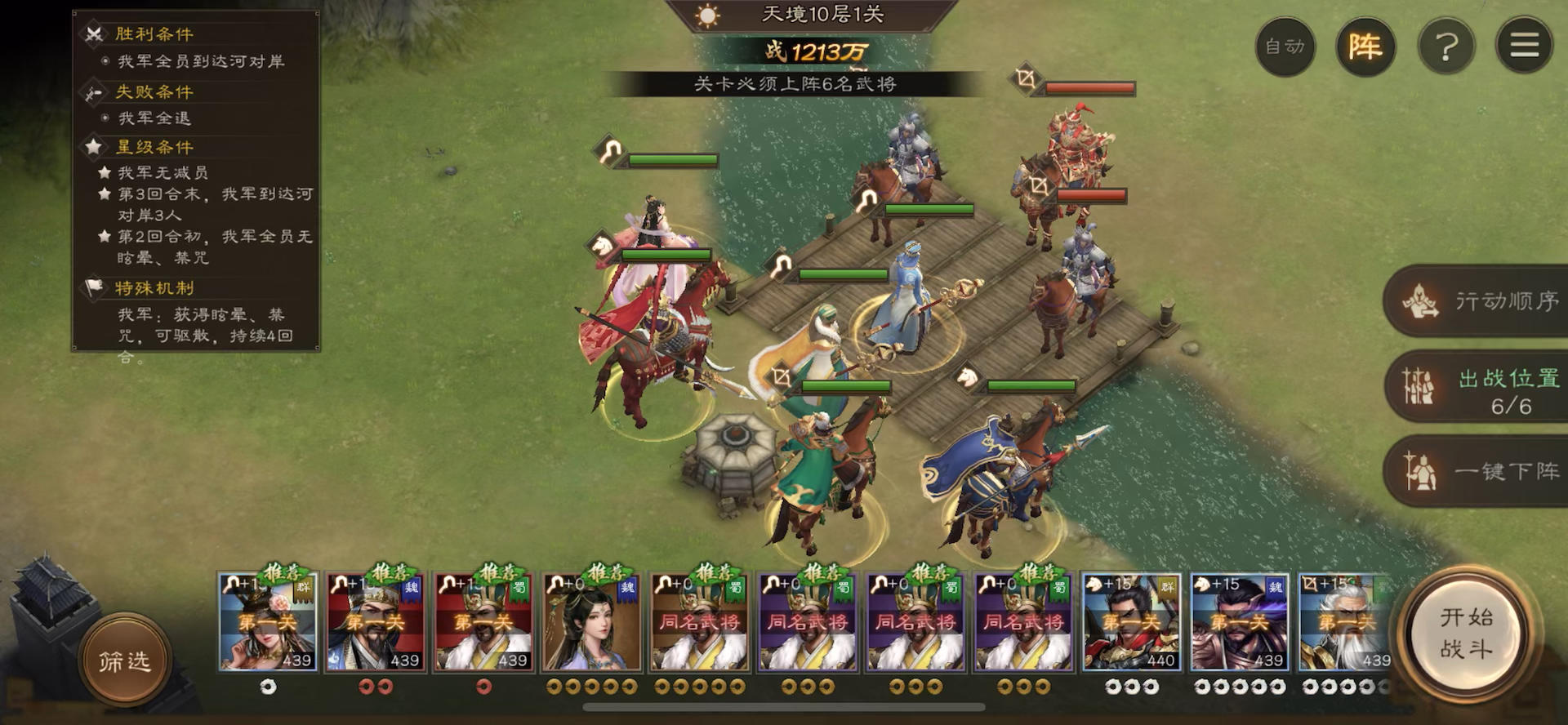 本期南华幻境稍微有点难度的是最后两关, 10-1过关技巧在于: 1.上特殊紫卡糜竺(或者高贵的高星稀有橙卡甄姬); 2.让糜竺现在次靠前的中心位置,受击后触发被动清除友军defuff,第二回合即可全体移动; 3.用AOE技能武将(吕布 夏侯渊 黄忠等)一人全灭敌军,其他人过桥,最后貂蝉再动AOE武将过关。 【10-1过关最低要求有糜竺和貂蝉(五星就够用)】 #新三国志曹操传创作者征集令