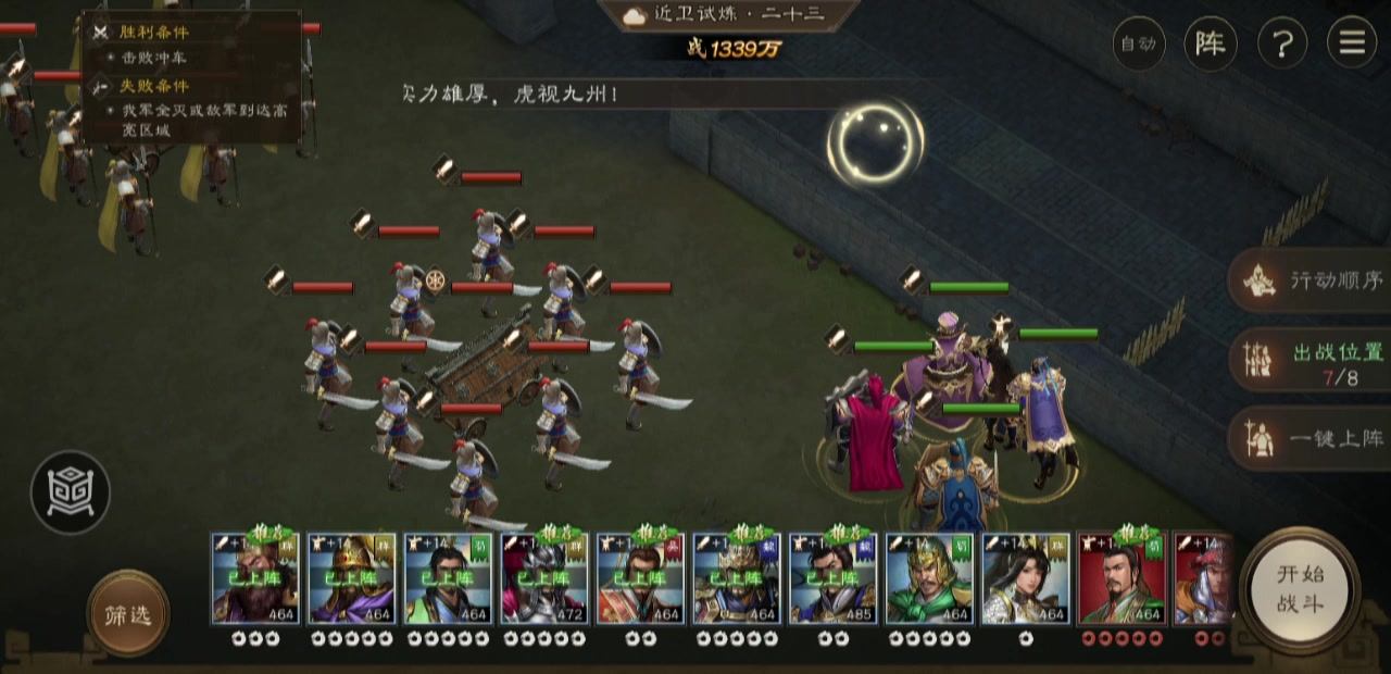 新更新的装备本也就近卫能打一点,其他都是被暴打…等级压制减伤太猛了,近卫也才死皮赖脸磨过两层,其他近卫都起到辅助作用,增加整体肉度就行,比如袁绍孙权,孙权稍微还有点灼烧伤害,其他人基本没啥伤害了,总体靠肉盾双雄去磨: 魏延,数值打不过那就反弹,一点点反弹致死,反正对面也没奶妈,回合够慢慢磨就是了。 董卓:董胖子难得有用武之地,只要每回合封住路口站在俩炮车身边,就能配合魏延磨死过关。 目前跨两层