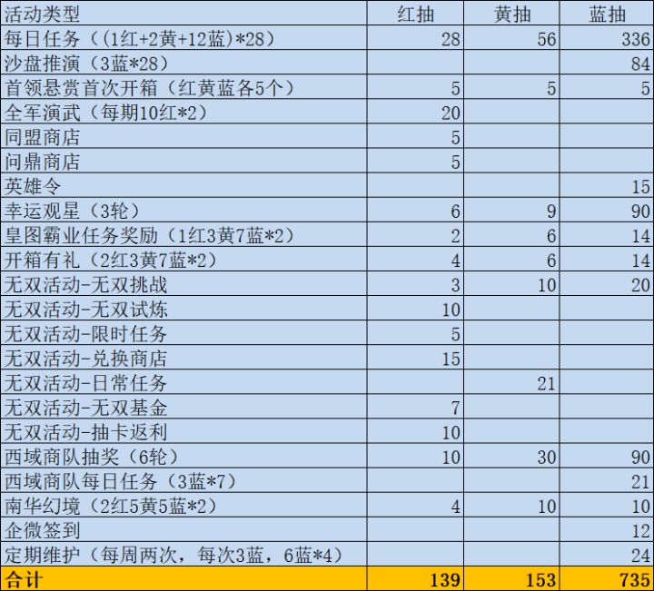 #新三国志曹操传创作者征集令 #新三国志曹零氪攻略 新三曹做为一款战棋养成及抽卡手游,给的福利还是很多的,可谓是不肝不氪也能玩得很舒服,那么做为一个零氪白嫖档,每月能获得多少资源呢?下面笔者就进行了零氪一个月内获取资源(红黄蓝抽,金珠未包含)的一个统计,统计假设玩家已经玩满40天拿到了每日任务最高一层的奖励,记录如下:对于各种抽的使用来说,红抽只能在无双活动中使用,一定要凑到150抽才去抽,