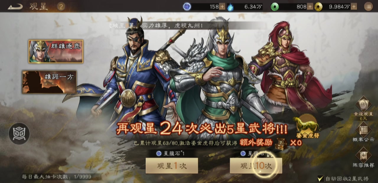 前600多抽视频整丢了,抽到三个稀有,香香,典韦和荀彧,只有香香是重的已练魂,保底给了个吕布,换成诸葛亮升到14星了。观星这次选择拉甄姬,主要也是随机神兵开到两个甄姬,她5星神兵才好用,索性直接把她弄毕业了算了,后100多抽大池子随机也给了一个甄姬,观星的快乐就来源于大池子随机出现自己主拉的将,根据需求优先级,一个个拉起来,648零元购加皇图一个神兵箱子,刚好给甄姬弄5星神兵,也是唯一神兵星级比武
