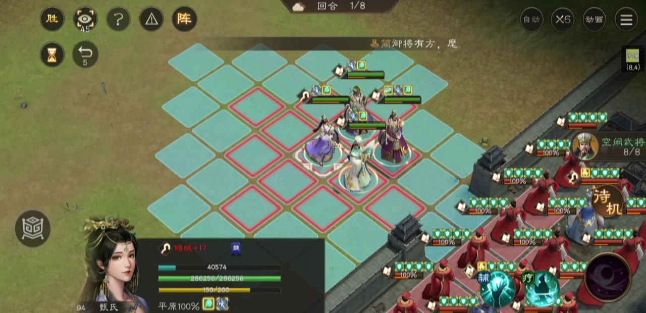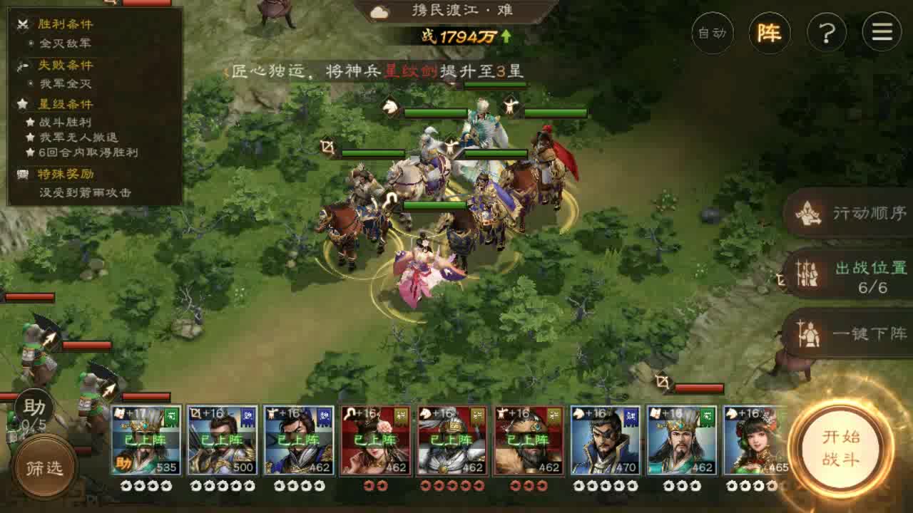 这关打了两个来点终于最后回合操作了最后一个人极限过了,用已经过了这关的大佬们的经验有一部分作用,就是两边分配人员: 左侧上阵庞统,郭嘉,李儒和貂蝉,庞统至少9星会拉人,郭嘉把最好的装备都给他,左侧输出压力大,虽然我郭嘉就10星,奈何郭嘉大招有禁疗2回合效果非常重要不得不上,李儒的毒也是输出主力,像我这种比较低配的最好给郭嘉和李儒带火月禁疗40%星符,要不郭嘉星低输出秒不掉,只能尽可能限制这些舞娘
