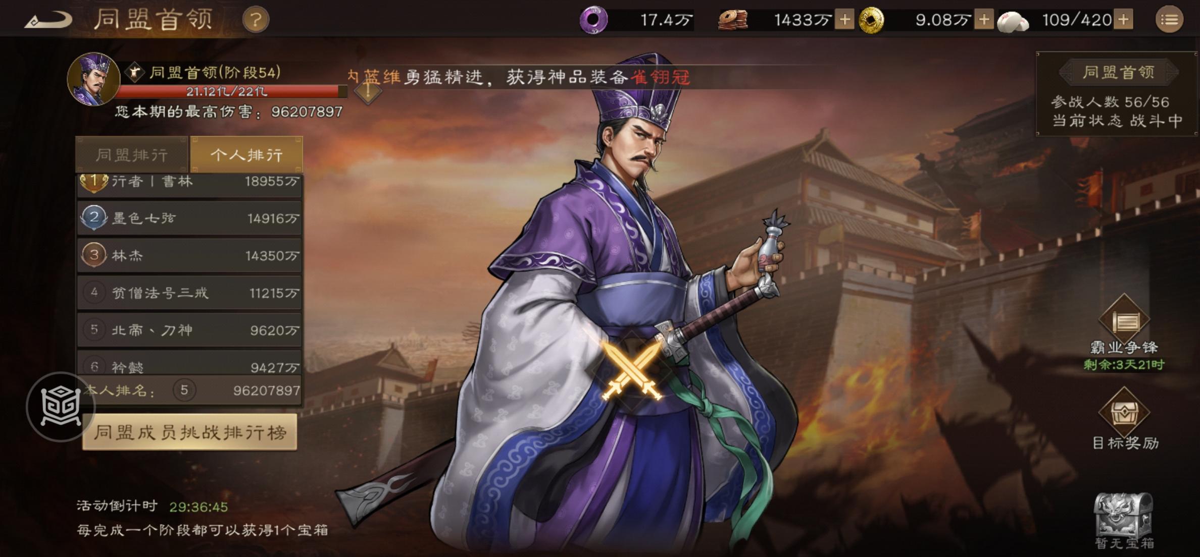 拥有大面积杀伤性武器的大法师们的天下来了,感觉这个同盟boss就是给郭嘉诸葛亮这种无双大法师量身定制的,试了不少阵容,包括同样拥有大面积杀伤的陈宫大帝,根据我自身情况,最终选出了我的极限伤害阵容,既吕布,刘备,诸葛亮,郭嘉,庞统。 选吕布是因为练度最高,一身满级满突破装备,尽管如此,打李儒想用吕布打出好效果必须配上庞统,凤雏的拉人技能还是好用的,第一回合可以拉人让一堆李儒包围吕布,方便吕布连击