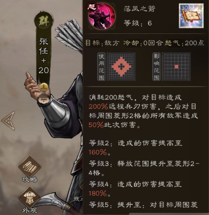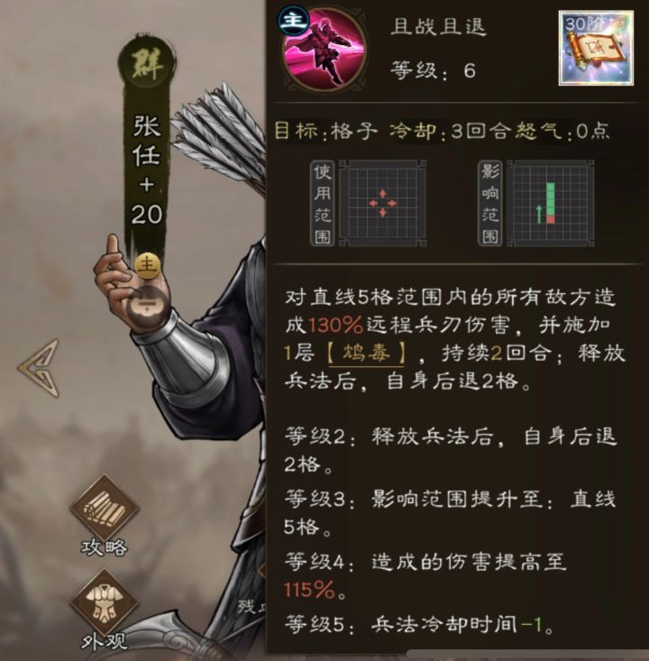 群雄阵营的弓兵系兵种,从开服空白7个月之久。如今终于千呼万唤始出来,为稀有步弓兵 西川落凤督-张任。张任被动特点为真伤追斩,致死召箭。召唤物【陷敌之矢】简称:复仇箭。生命1;防御1;韧性1。攻击力继承张任进战场前面板105%,精神和幸运继承100%。闪避几率和格挡几率为0%。等级继承张任。(张任配青鸟,神兽出场真伤致死召唤复仇箭,复仇箭不触发张任被动,张任走高攻路线和需要高体的青鸟不是最佳搭