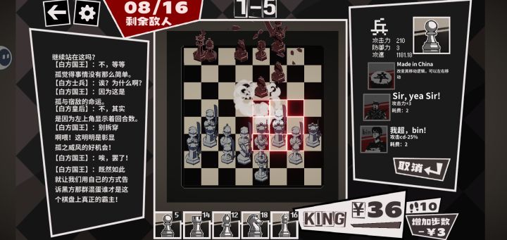 整体的创意很好,P5风格和象棋棋盘的融合确实一眼看上去很舒心,是能把人留下来看看是什么花头的好美术风格。其次就是开场的既定演出,一下子把幽默风格带进叙事,把为什么象棋会变成塔防给讲清楚了。整体战斗的表现不能说是有十分十分出彩的地方,但是2D像素风的刀光作为战斗表现感觉也很不错,至少是留下了印象的。
