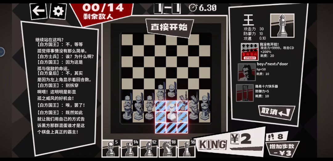 当钱不够的时候点点点,不扣钱,属性照加,应该是bug,康康修复。 游戏很有意思。全是梗,赛文属实笑拉了😃😃😃😃😃 另外国际象棋没有抱马脚一说,卡位了还是可以走的,小兵一开始走两格也可以的,还有王车易位。 关卡有些单一,希望后期会有更多有意思的内容加入,棒棒。🙋🙋🙋