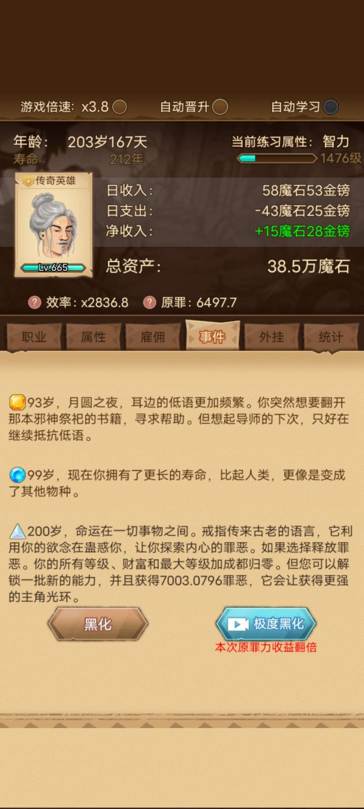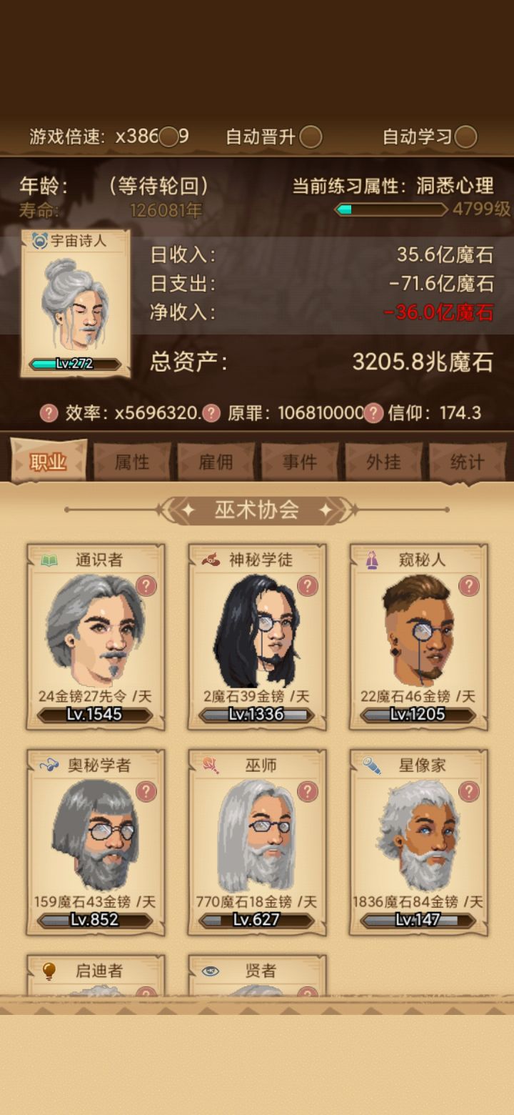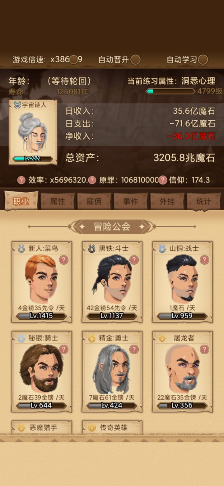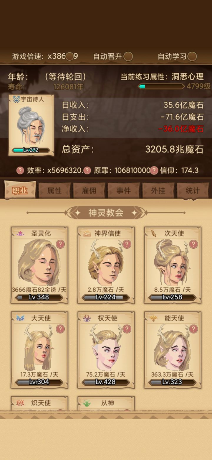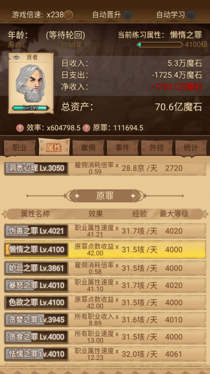 x=16.2,实际上宽容显示的倍率也是16.20,公式正确。不过几把一趟流程的极限也就是57153.6罪恶了,因为雇佣的加成有极限,而后面技能的升级所需经验越来越多,所以无限叠技能等级上限不成立,而且得不偿失。大天使什么的根本出不来,美德4技能也就出不来。还有雇佣里面提到的慷慨根本没有见到这个界面,估计要大后期才有,还不知道能不能玩那么久呢。上图。还有游戏里说罪恶值越高罪恶属性技能升级越快,这个效果不明显,关键还是要有继承等级,没有升级慢,有就升级快,可惜黑化后就清零,无奈!就这样了。