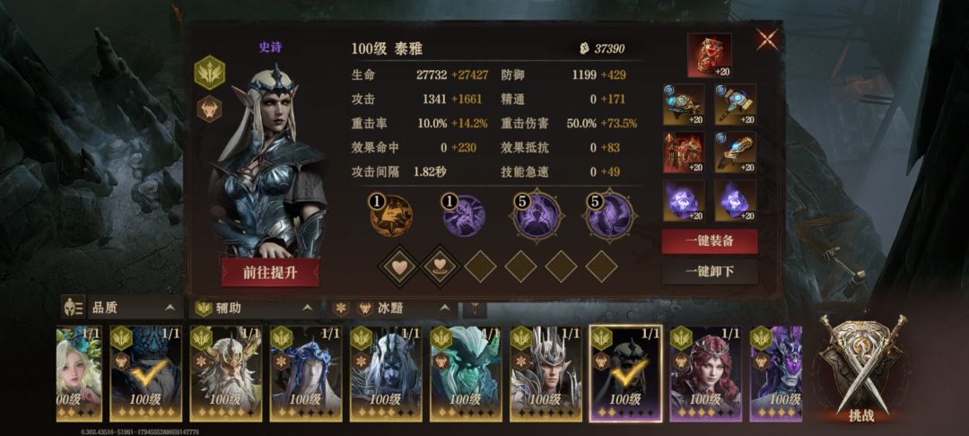 #龙息神寂 #龙息神寂攻略 这阵容很平民了,估计大部分人都应该有了。 重点:泰雅的技能急速尽量在35以上,效果命中300左右,主要是禁疗。我的这个数值比较低,有风险续不上buff 其次,她的装备带挨打套。就我图片里面的装备就行了 其他没有什么特别的,装备和数值抄就行了。就是注意把效果命中给拉瓦和冰女堆一下 然后冰老头攻击暴击爆伤拉起来。 没有设置时间技能轴,自动释放就行了 要是想追求更高的伤害就
