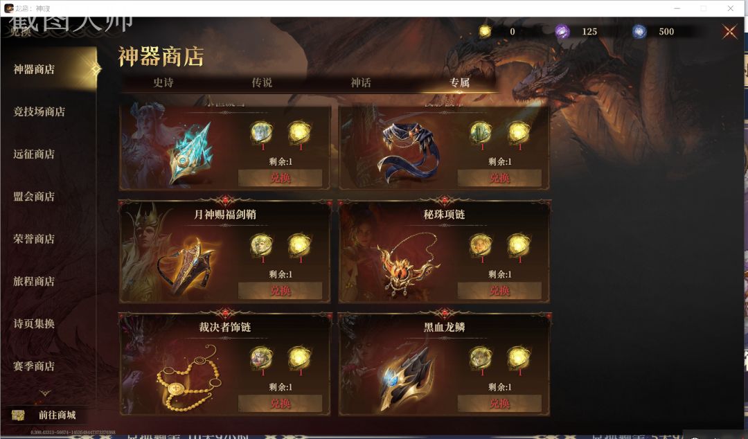 最近看到一些小伙伴有问神器如何兑换的问题。 个人有点心得体会。讲解一下。 首先是点兑换页面可以跳出神器商店的页面! 如图所示: 分别是史诗,传说,神话,专属。四大类。 史诗是效果最差的,它消耗的是你抽卡重复的稀有卡材料。一般来说不值得升级这个项,我一开始不知道还浪费了不少神器材料。而材料在你用掉以后是不能返还的。新人我推荐不要买这个了! 专属则是需要两个魂石来换的,一个是六系稀有输出的魂,另外一个
