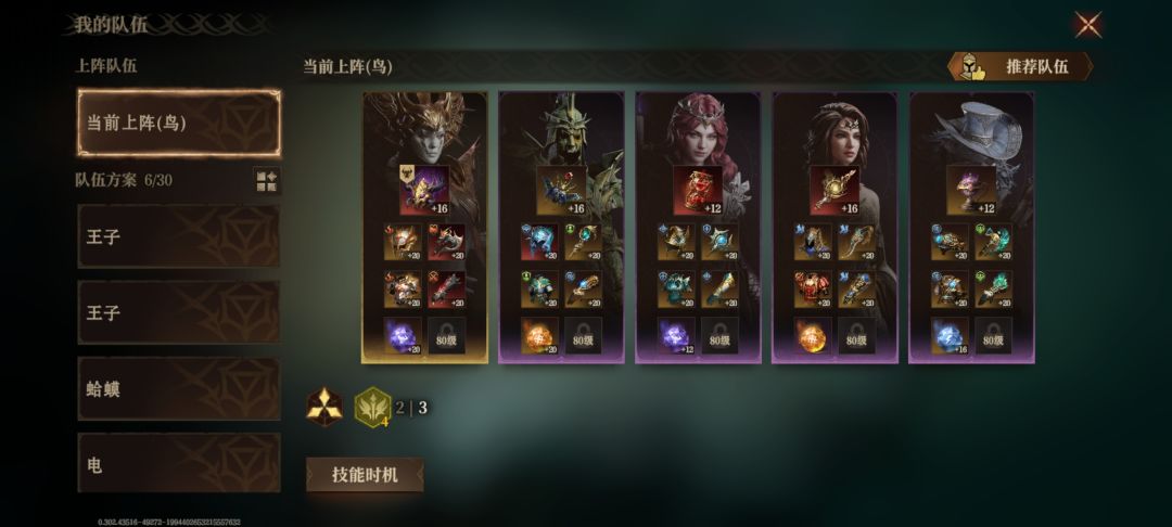 #宝藏游戏安利派对 1-天赋:鸟姐三件套最后一排,冰盾泥魔第一排。 2-装备:鸟姐古木红色装备,暴力至上,终焉之诫,精准屠戮,统御者之威。注意的是古木是精通伤害,不吃暴击爆伤。 银月魔偶师套,汲能器械 泥魔带先祖守护套,月华之光。要有效果命中 冰盾带三只耳套装,剩下一个随便。 3-神器:鸟姐专武,古木女王扇,银月女巫残留物,冰盾闪金背心,泥魔号角。 4-站位 5-思路,等你有了我说的那些装备,就