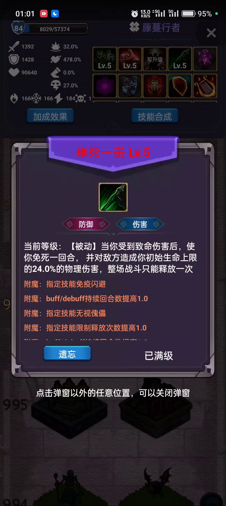 大家相信也都看过大佬们之前开发的荆棘反伤攻略,但是由于版本更新,石魔护身符由被动改为触发,导致我们无法获得技能效果,所以我就对这个流派做了一点小小的改动。 技能方面 首先是我们的技能选择,荆棘、年轮、残阳、极限光环必备 其次,由于我们需要反伤来进行换血,前期遗物或者角色技能等级不高的情况下,可以合成岩石禁卫提高血量 最后由于石魔护身符改动,导致我们无法保证不被怪一下打死,并且免死技能也由原来的触发