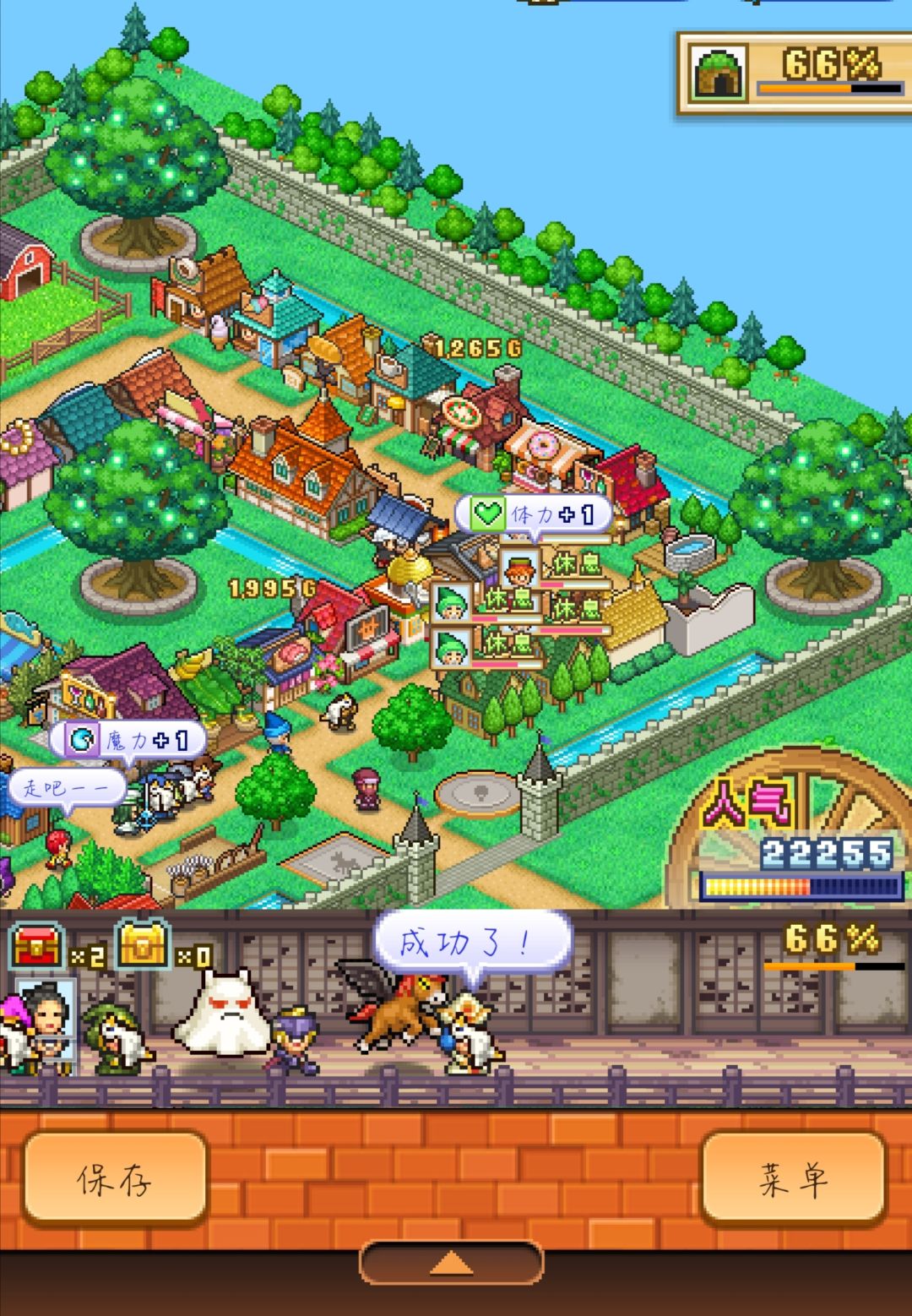 上图是我玩的一些截图,每个人都杀怪基本上怪一露脸就没了。由于所有人都转了很多职业属性看起来有些低,要是都转成高级职业就好看多了。每个人最低都有3个奖牌,理想是转成皇家护卫跟大魔法师还没转完。 出场拆掉所有建筑只留武器店,再给每个人换上最贵武器。这样他们就只能逛武器店,慢慢多开十几个武器店基本就不缺钱了。然后就是做任务,商店开了就买道具送给冒险者提升勤奋度。 每个职业喜欢的道具是不一样的,比如