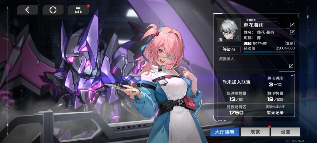 先要明白一点活着才有输出,闪避没有无敌帧,策划简直是用脚填的数值,后面怪的攻击力太高了,光污染严重,导致怪攻击预警看不清,重点点名忍者,真的抽象。 开局自选 选紫色蝙蝠(图一),简单无脑易上手 驾驶员 紫色爱迪丝(图二,限定武器池里面就有,用开局白送的限定武器票抽就行了) 加格斗伤害 技能除了支援技和切人技 点满 配队 一主C两辅助(不要切辅助机,辅助机也没有练的必要,因为驾驶员技能开启后会同时吃
