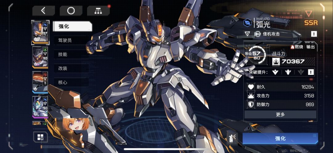 因为内容完成度不是很高,后续测试改动肯定会很大,不过按照这次测试的内容大致做个配队攻略 一个队伍上阵5台机甲,入场位三个,支援位两个, 只需要养一台主C就行了,全养资源不够也没太大必要 推荐主C 机甲:岚 机师:卡希珊 二测妥妥超模怪 入场位2 机甲:随意 机师:女主 必养 最高的精神技攻击加成 入场位3 机甲:随意 机师:吉赛尔(精神技回血满级技能百分之五十五,溢出加盾) 三号位机师选择比较多,