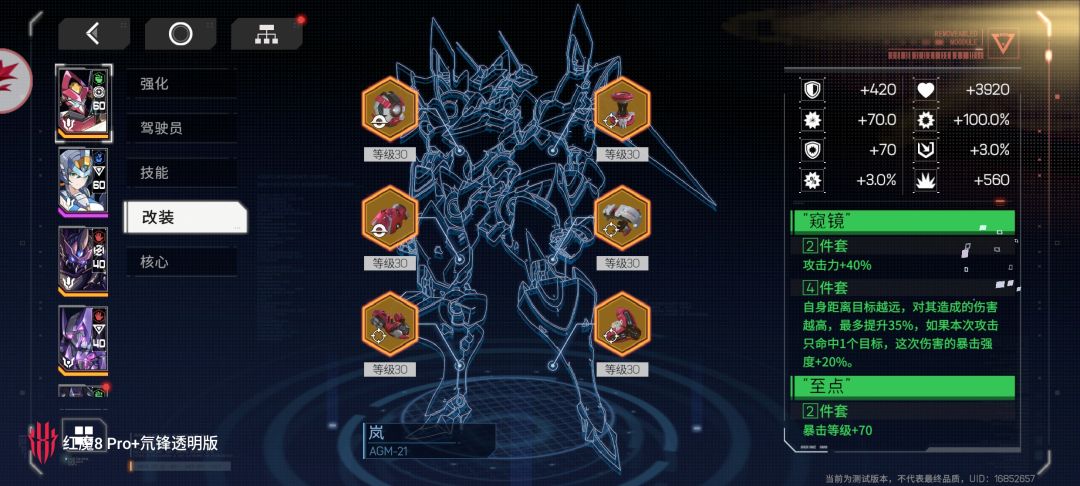 因为内容完成度不是很高,后续测试改动肯定会很大,不过按照这次测试的内容大致做个配队攻略 一个队伍上阵5台机甲,入场位三个,支援位两个, 只需要养一台主C就行了,全养资源不够也没太大必要 推荐主C 机甲:岚 机师:卡希珊 二测妥妥超模怪 入场位2 机甲:随意 机师:女主 必养 最高的精神技攻击加成 入场位3 机甲:随意 机师:吉赛尔(精神技回血满级技能百分之五十五,溢出加盾) 三号位机师选择比较多,