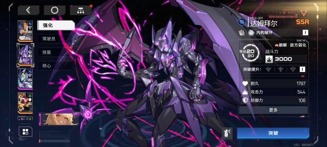 先要明白一点活着才有输出,闪避没有无敌帧,策划简直是用脚填的数值,后面怪的攻击力太高了,光污染严重,导致怪攻击预警看不清,重点点名忍者,真的抽象。 开局自选 选紫色蝙蝠(图一),简单无脑易上手 驾驶员 紫色爱迪丝(图二,限定武器池里面就有,用开局白送的限定武器票抽就行了) 加格斗伤害 技能除了支援技和切人技 点满 配队 一主C两辅助(不要切辅助机,辅助机也没有练的必要,因为驾驶员技能开启后会同时吃