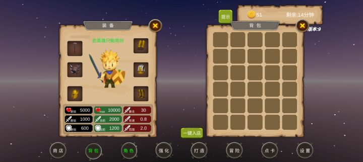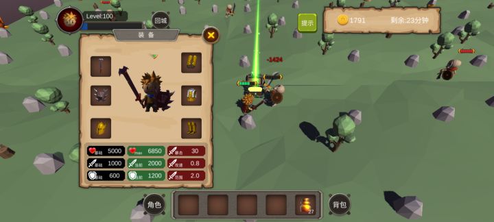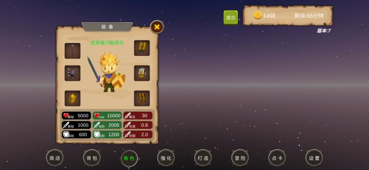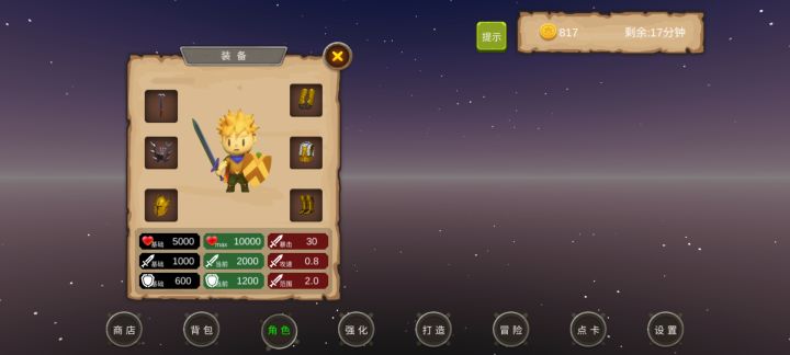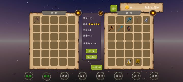 游戏虽然单调,打发时间用还行。0-10地图爆一星装备,20-30地图最高爆2星装备,40-50地图最高爆3星装备,60-70地图最高爆4星装备,80-90地图最高爆5星装备。一星装备最高能强化到20,最高五星能强化到100,一星能打造1点暴击,五星打造5点暴击。先在1图刷一套装备,然后刷装备卖钱,两件一星攻击装备和两件一星防御装备强化到20,两件加血的装备强化随意。注意从低级图攒药瓶越级打装备,越