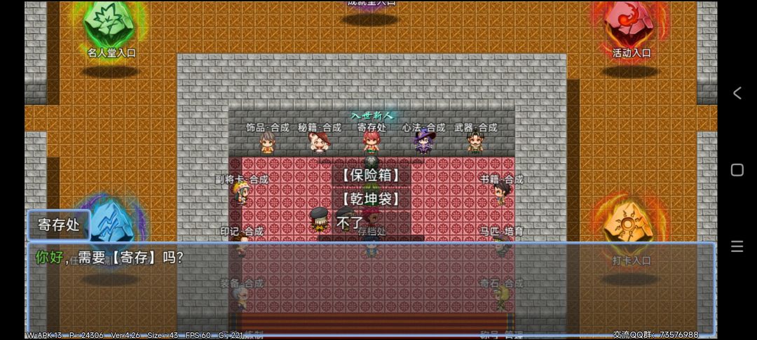 卧龙传666#发现好游戏 第一章 第3部分 进入荣耀厅内可在保险箱内寄存背包物品如下图 (背包满了会降低人物移速,奇慢无比) 现在荣耀厅主要功能介绍完毕,该准备战斗了 如下图各人物给张飞装备鱼竿及背包有的装备 出城往上走,右边山洞打黄巾兵,洞内有宝箱有一封信必拿,也可战斗获取装备与卡片给人物都装备好,如图 再次提示下挂机小技巧,如下图设置好 可在洞内自动挂机解放双手 黄巾洞获得装备及卡片都装备上