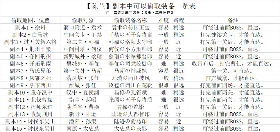 【陈兰】副本中可以偷取装备一览表
