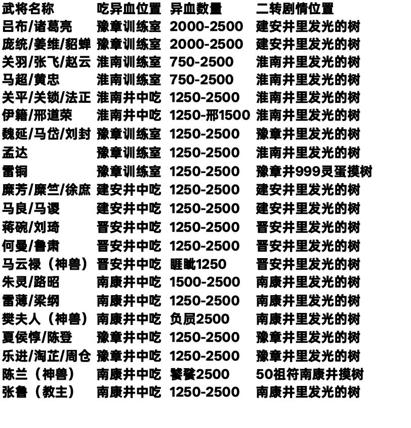 目前我获得人物的全三转天赋,缺少死鬼周仓,马云马大款(我是樊夫人),张鲁和陈兰没开放三转,乐进守西域,关平和陈老登在洛阳罚站。