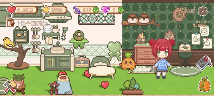 像素风的画面非常治愈 而且每一件衣服 家具都是作者精心设计 非常可爱 每次给小人换衣服都是换一种心情 每一个游客设计的都很细心 都有自己的性格和剧情线 感觉这一点非常的不错 而且甚至还有很抽象的语言 感觉不无聊了